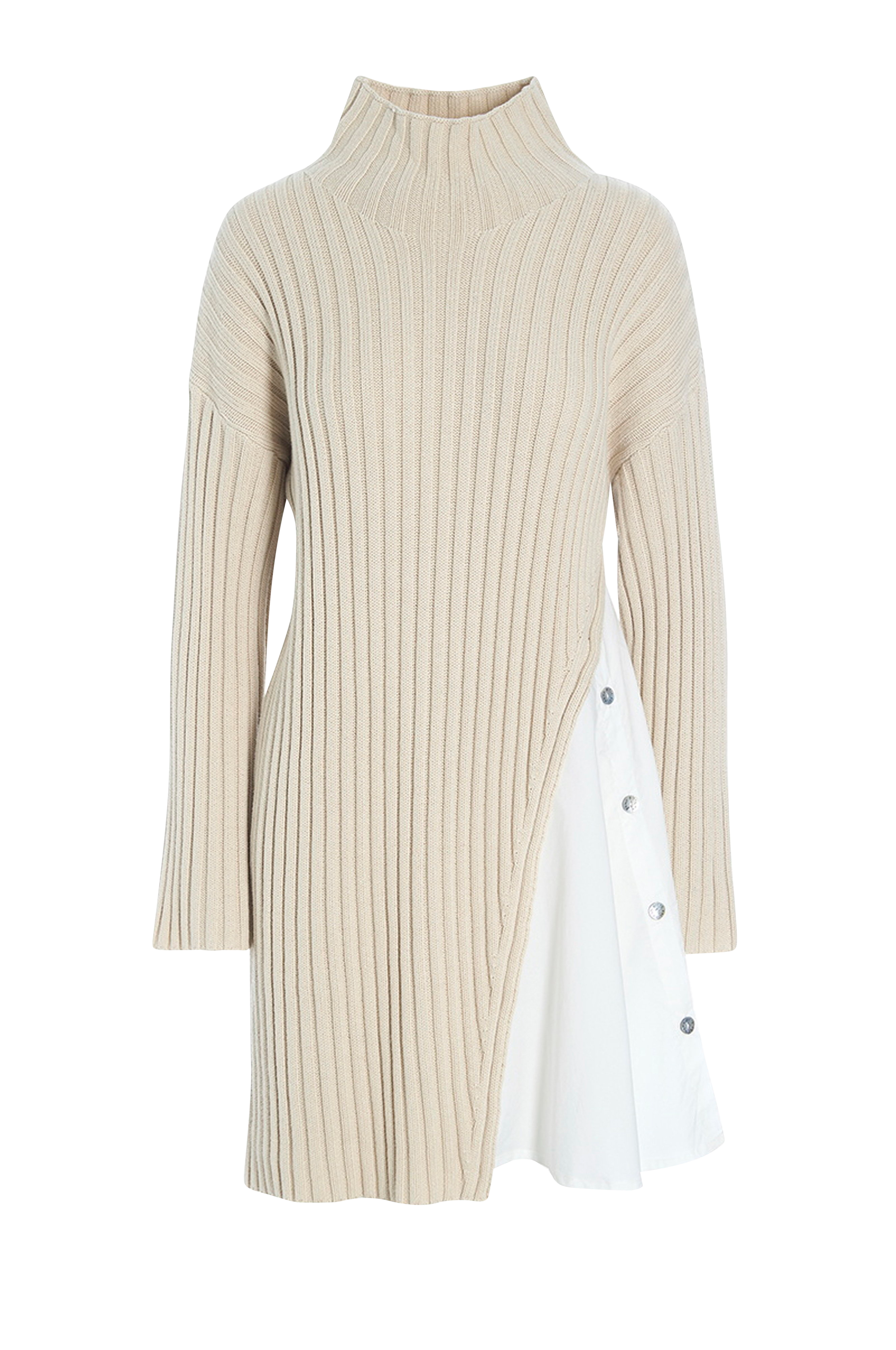 • Lige, ribstrikket model• Høj krave• Nedsænket skulder med langt ærme• Vævet indlæg med knapstolpe i den ene side• Længde: 90 cm i størrelse S