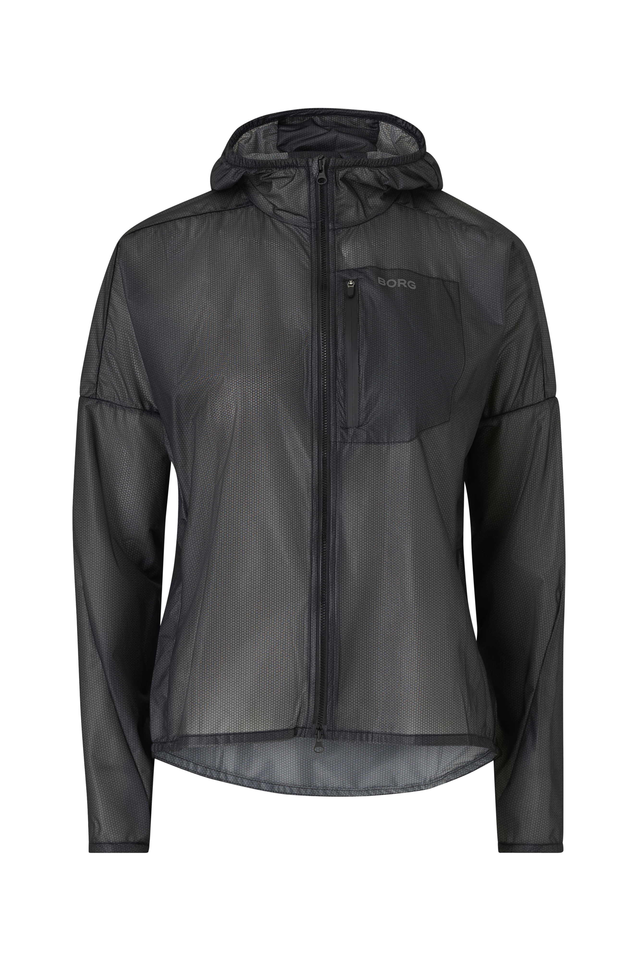 • Tynd, vandafvisende løbejakke• Ventilerende mesh under ærmerne• Fast hætte med elastisk kant• Lynlås• Brystlomme med lynlås• Vindtæt