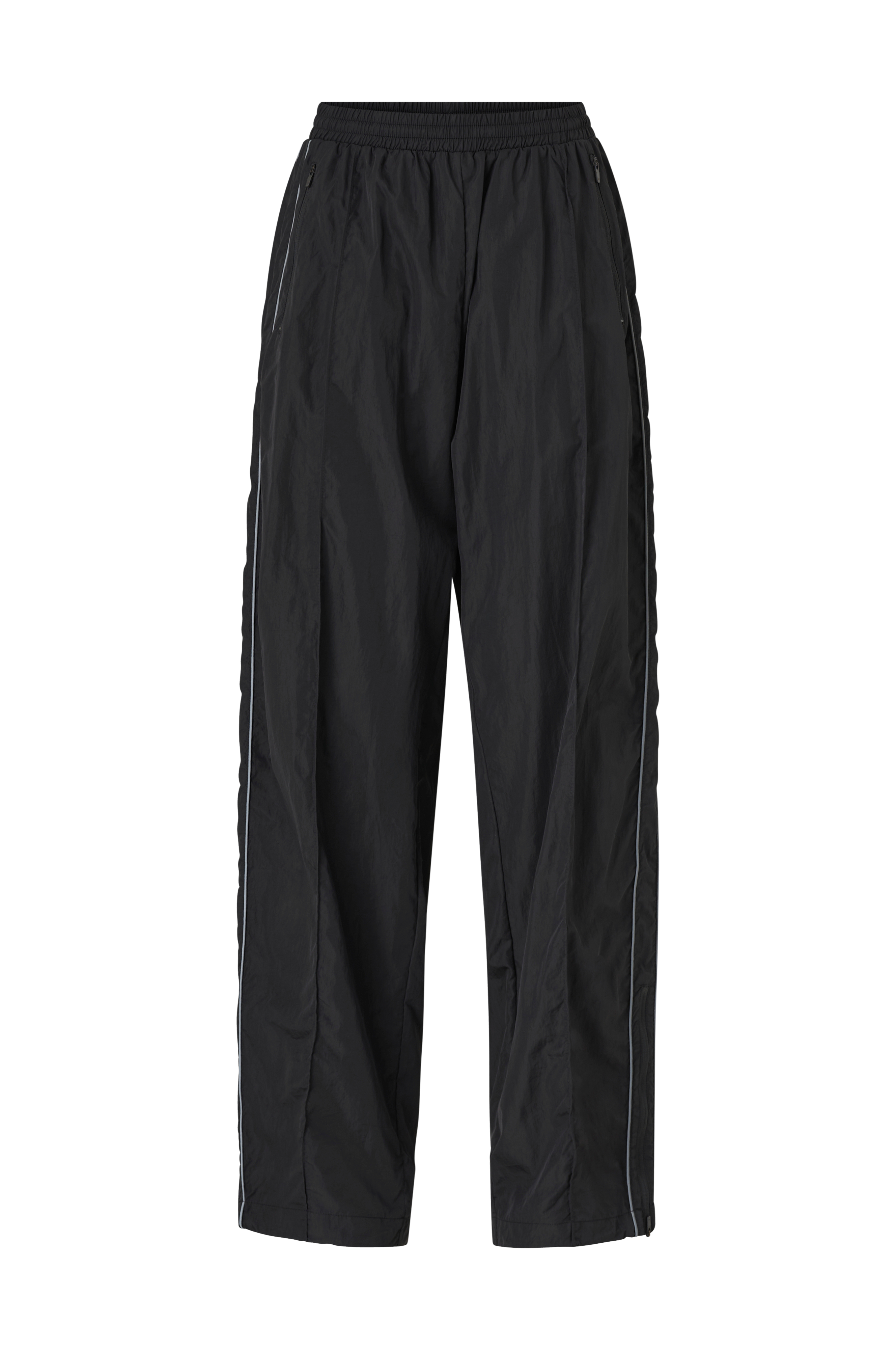 • Løs pasform• Lav, elastisk talje med indvendig træksnørre• Sidelommer med lynlås• Lynlåse ved enden af benene• Reflekterende passepoilkanter