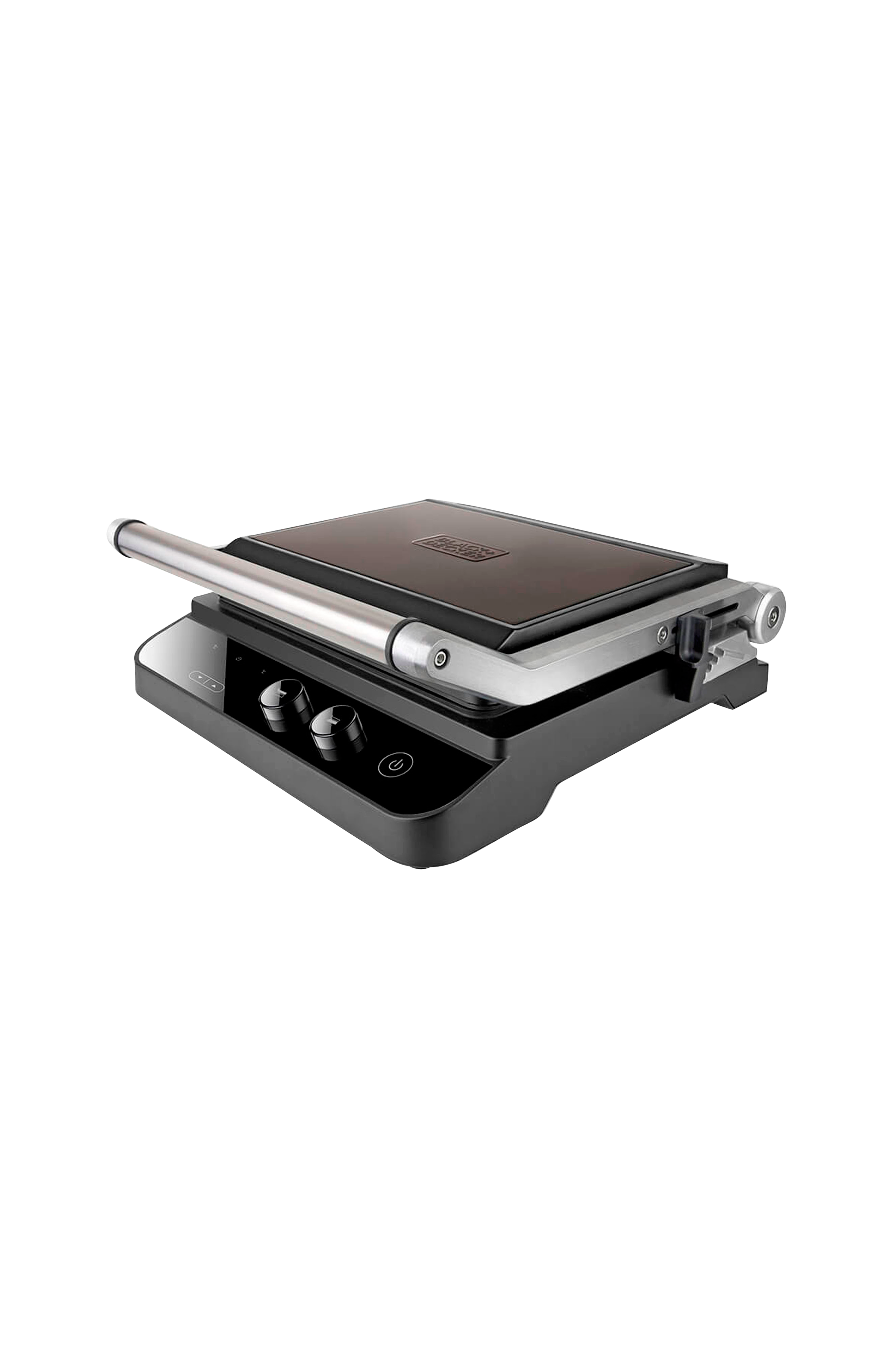 Kraftig 2000w bærbar grill 2 i 1: grill og stegeplade, med grillplader og glatte plader. Rist snacks og sandwiches, eller tilbered kød, fisk og grøntsager hurtigt på den type plade, du foretrækker, alt efter det ønskede resultat. Den vipbare topplade, der tilpasser sig madens tykkelse og har en åbning på 180º, kan tilberede dobbelt så meget mad på samme tid. hurtig, jævn tilberedning takket være dens 2000w effekt og dens varmesystem i direkte kontakt med pladerne. Hver plade har en uafhængig temperaturregulator og timer for at få de bedste resultater, og du kan styre tilberedningen fra din lcd-skærm.