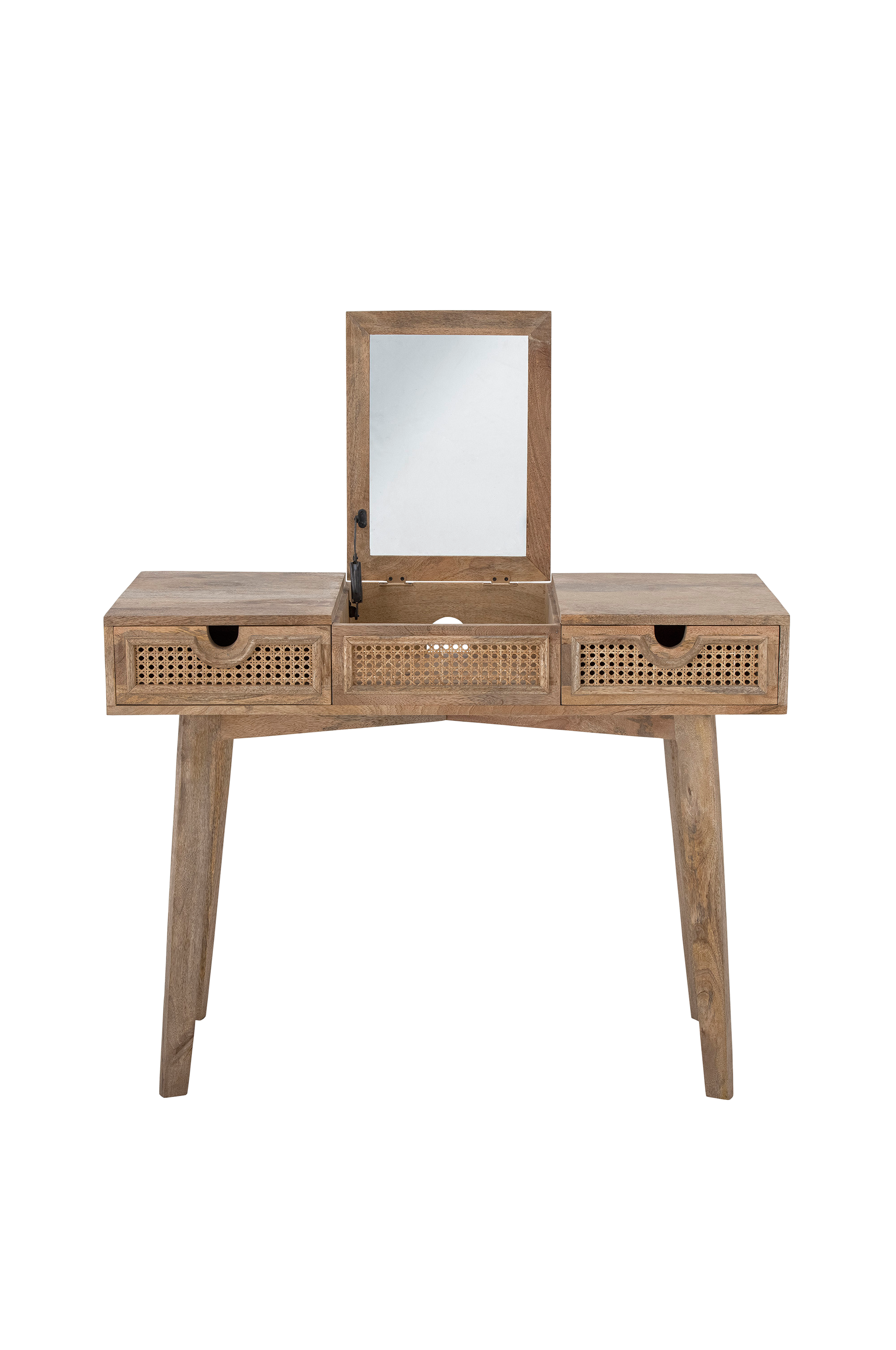 Perth aflastningsbord fra Bloomingville bliver et fint indslag i dit soveværelse. Det er fremstillet af en blanding af mangotræ, MDF og rotting i naturfarve, og har en smuk spejl samt to praktiske skuffer. Brug bordet som toiletbord eller skrivebord. Opbevar spejlet i bordet som en 2-i-1-løsning.