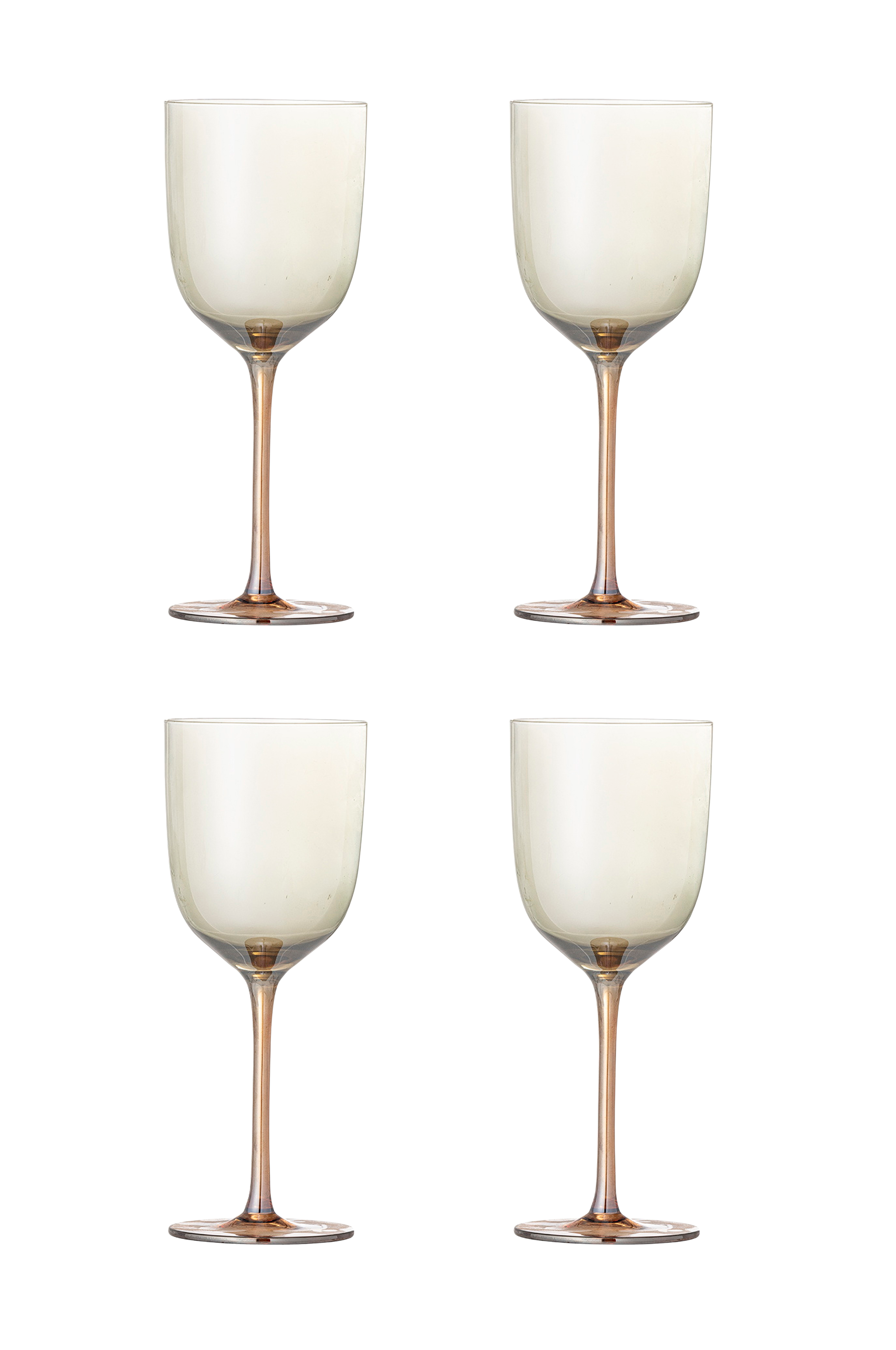 Aston-vinglasset fra bloomingville har en raffineret finish med en perlemorskant, der fanger lyset smukt. Det raffinerede look gør dem ideelle til både vin og dekorativ borddækning. Sættet består af 4 glas.
