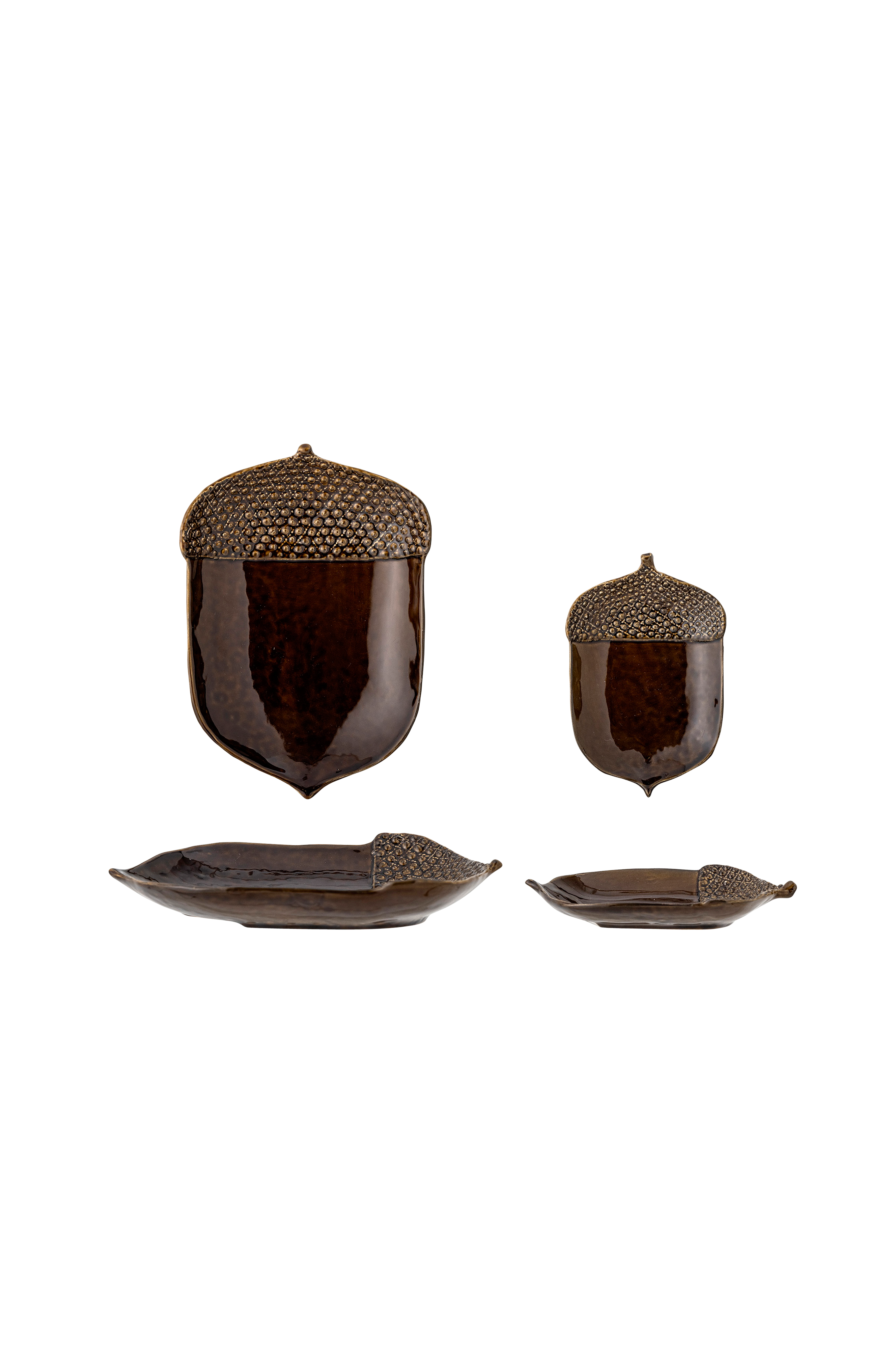 Server lækkerier på Adiya stentøjsbakken fra Bloomingville. Det er et sæt af to agern, glaseret i en smuk brun nuance med små gulddetaljer. De vil se pæne ud på julebordet eller under andre hyggelige stunder med dine kære. Mål: L15xB10/L22xB16 cm, 2-pak