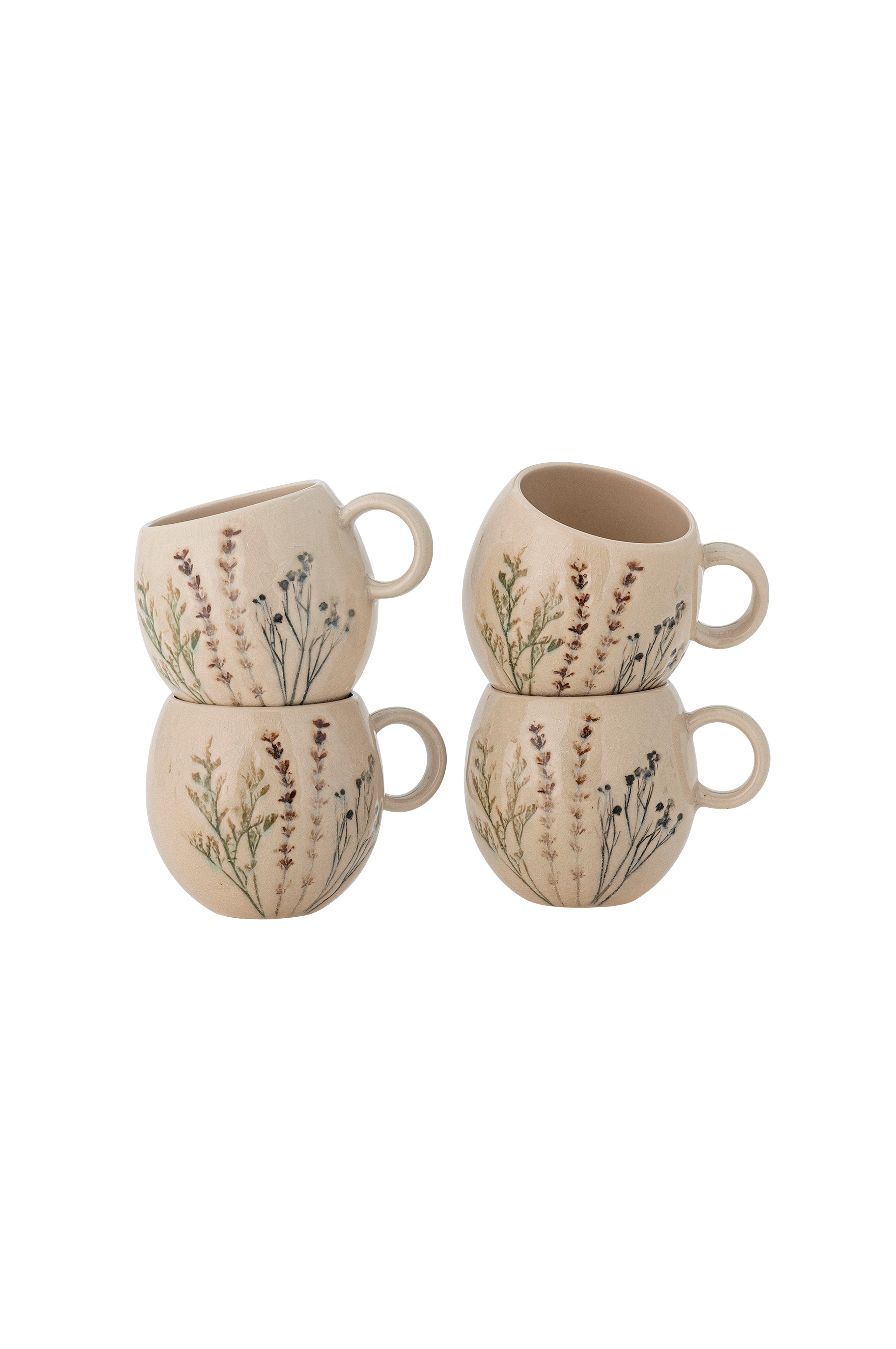 Bea-kruset fra Bloomingville er et smukt stentøjskrus med et fint blomstermotiv på den krakelerede glasur. Hvert krus er håndlavet, hvilket resulterer i naturlige variationer. Tåler opvaskemaskine og sælges i en pakke med fire.