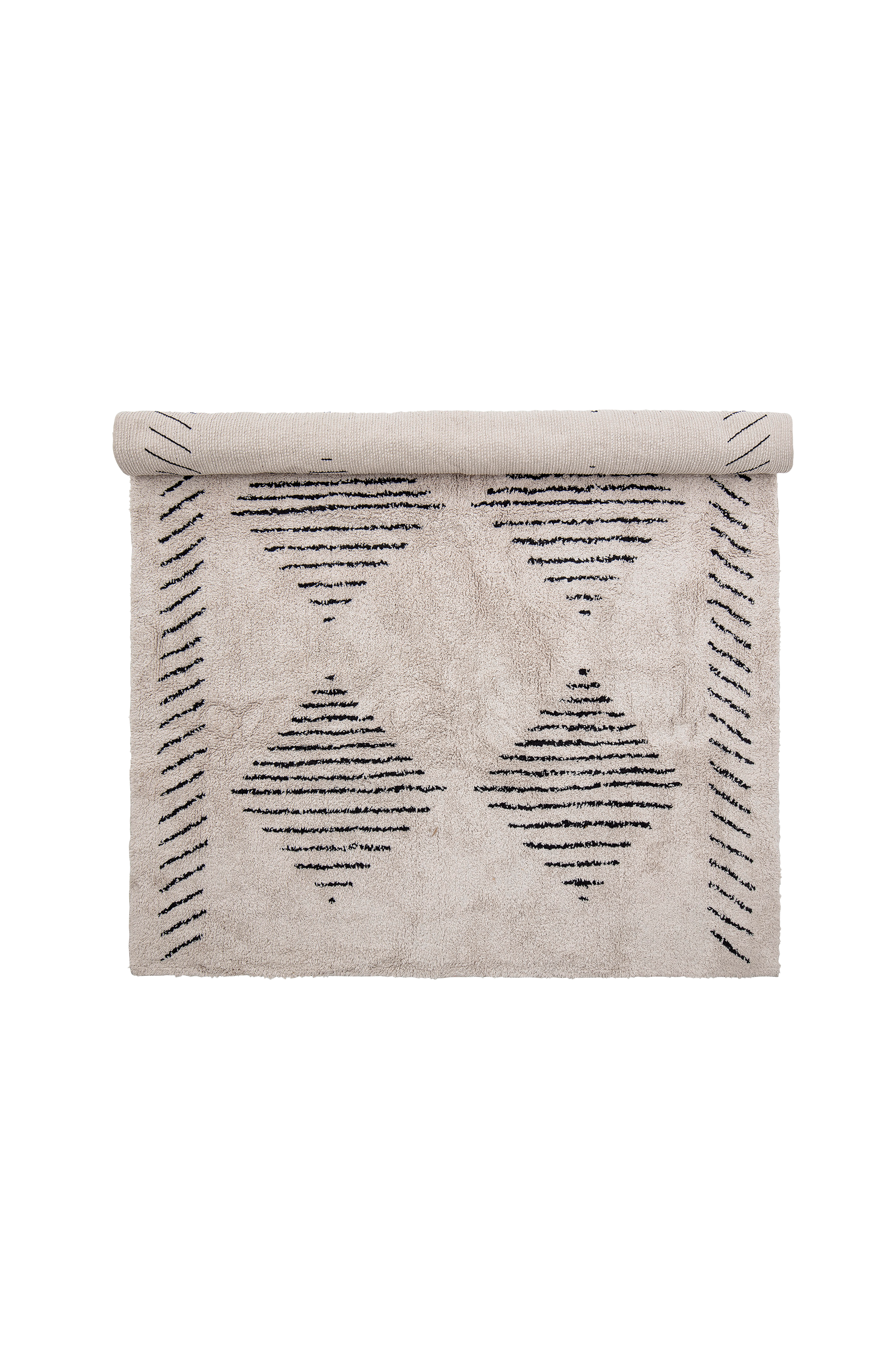Blødt, tuftet tæppe af bomuld i enkelt design med strukturmønster. Tæppet har en tæt, blød luv som er behagelig at gå på. Rengøring: Kun støvsugning og pletfjerning.