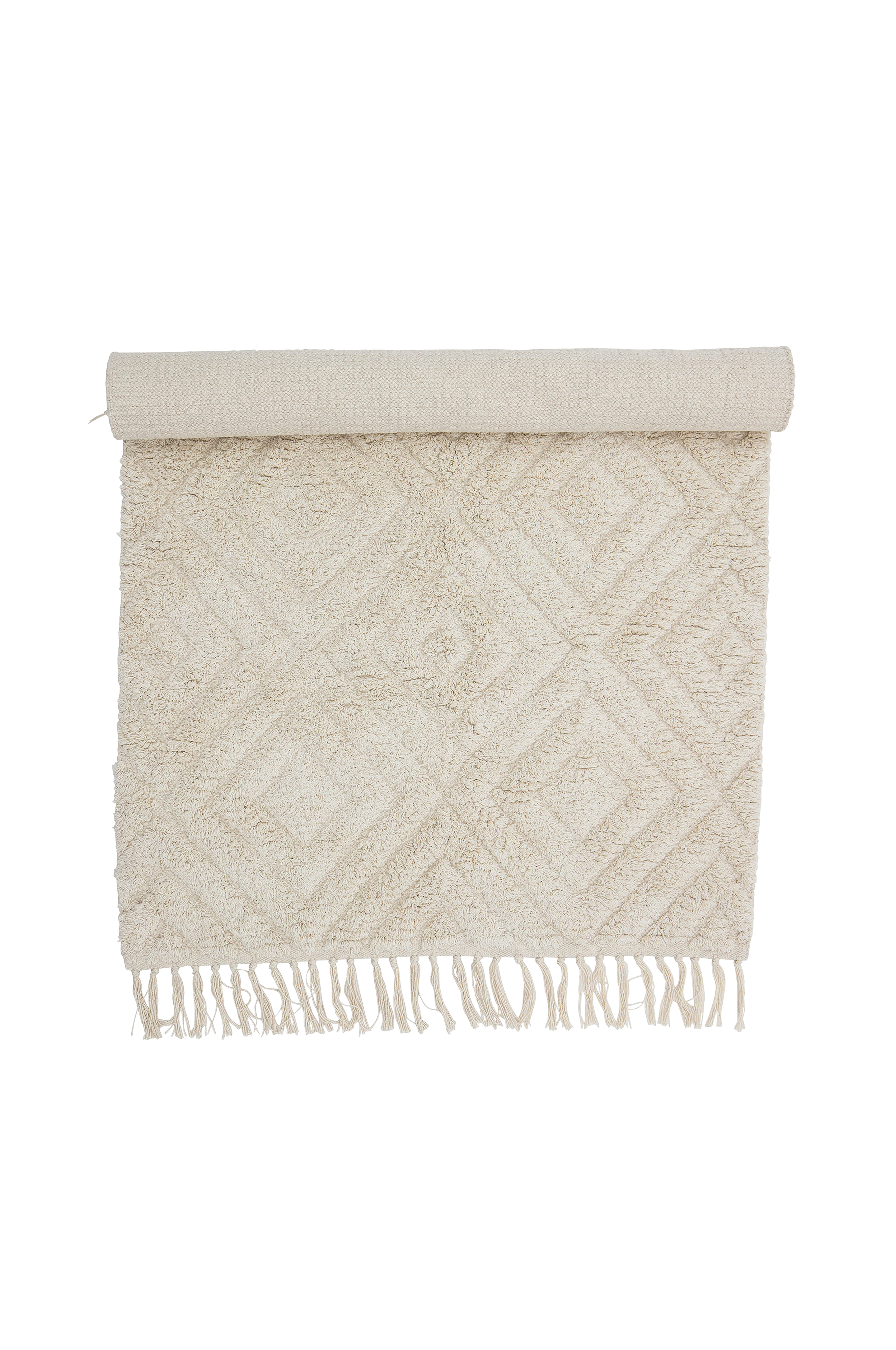 Lenna tæppe fra Bloomingville er fremstillet af 100% bomuld og har et smukt, tuftet mønster i naturfarve som giver din indretning et hjemligt udtryk. Gulvtæppet er rektangulært og giver dig lyst til at gå barfodet hele dagen! Det giver et hjemligt udtryk foran sengen eller i badeværelset.
