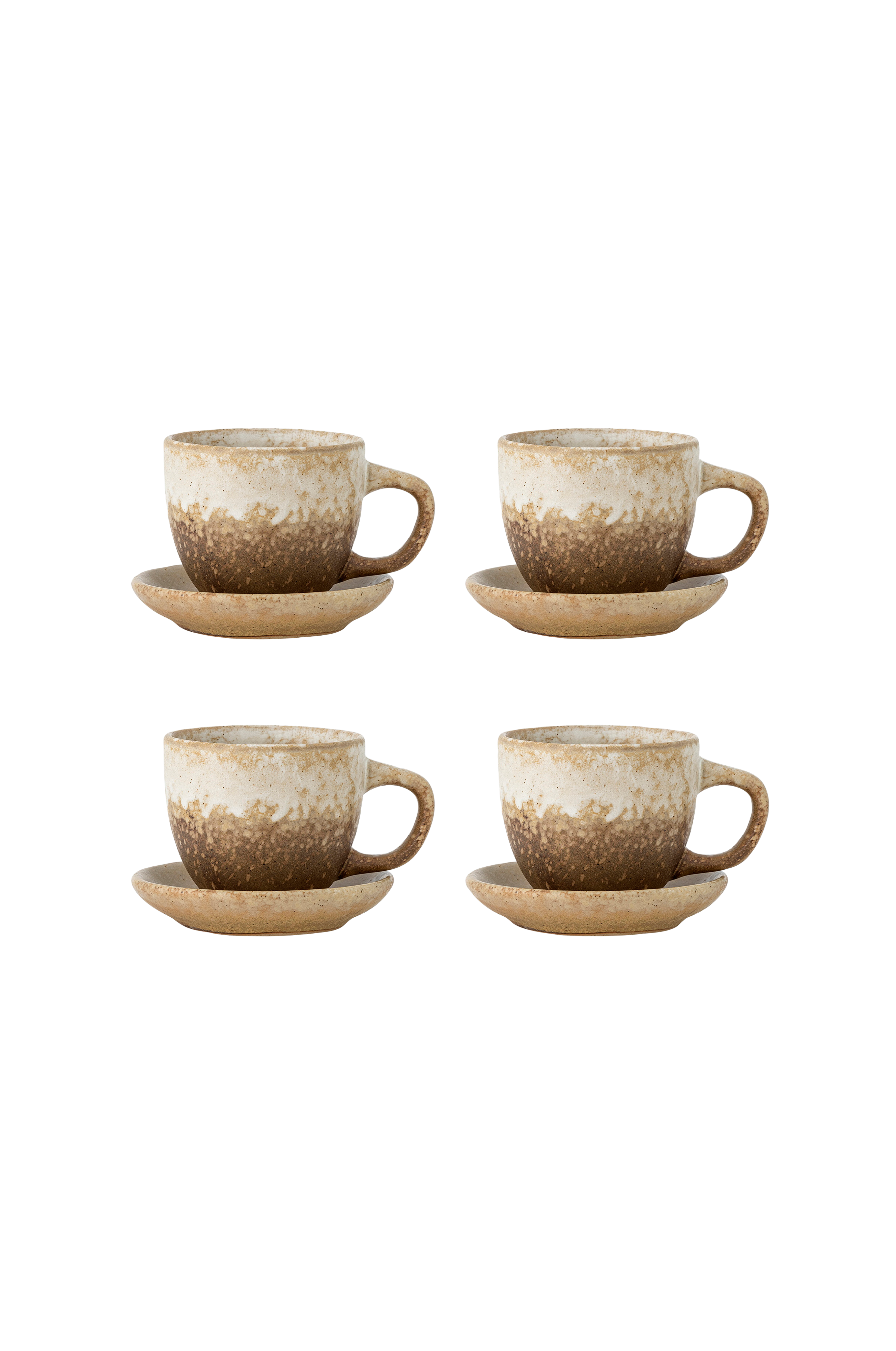 Brenta-koppen med underkop fra bloomingville kommer i et sæt på fire og er lavet af stentøj med en blød form og en smuk reaktiv glasur. De naturlige variationer i glasuren sikrer, at hver kop og underkop er unik.