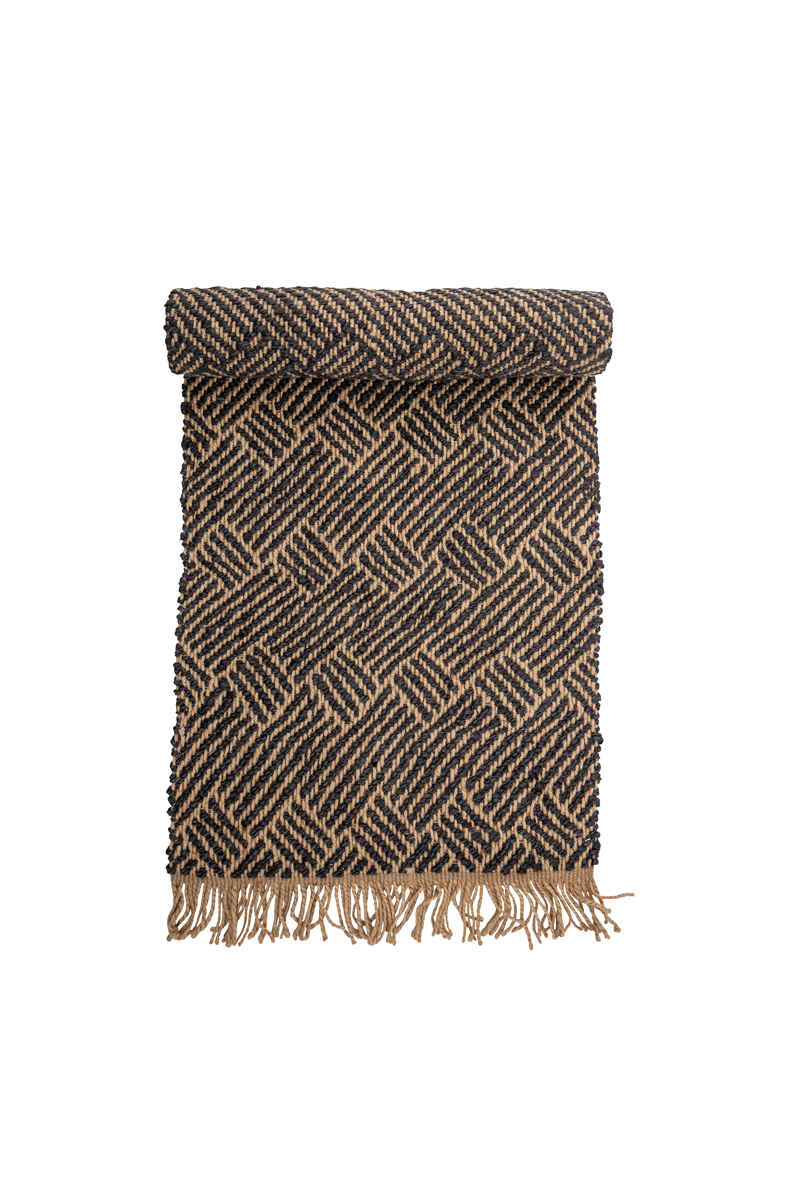 Aby tæppe fra Bloomingville er et diskret og elegant tæppe af jute med sort, geometrisk mønster. Gulvtæppets behagelige materiale gør at du vil gå barfodet hele dagen.