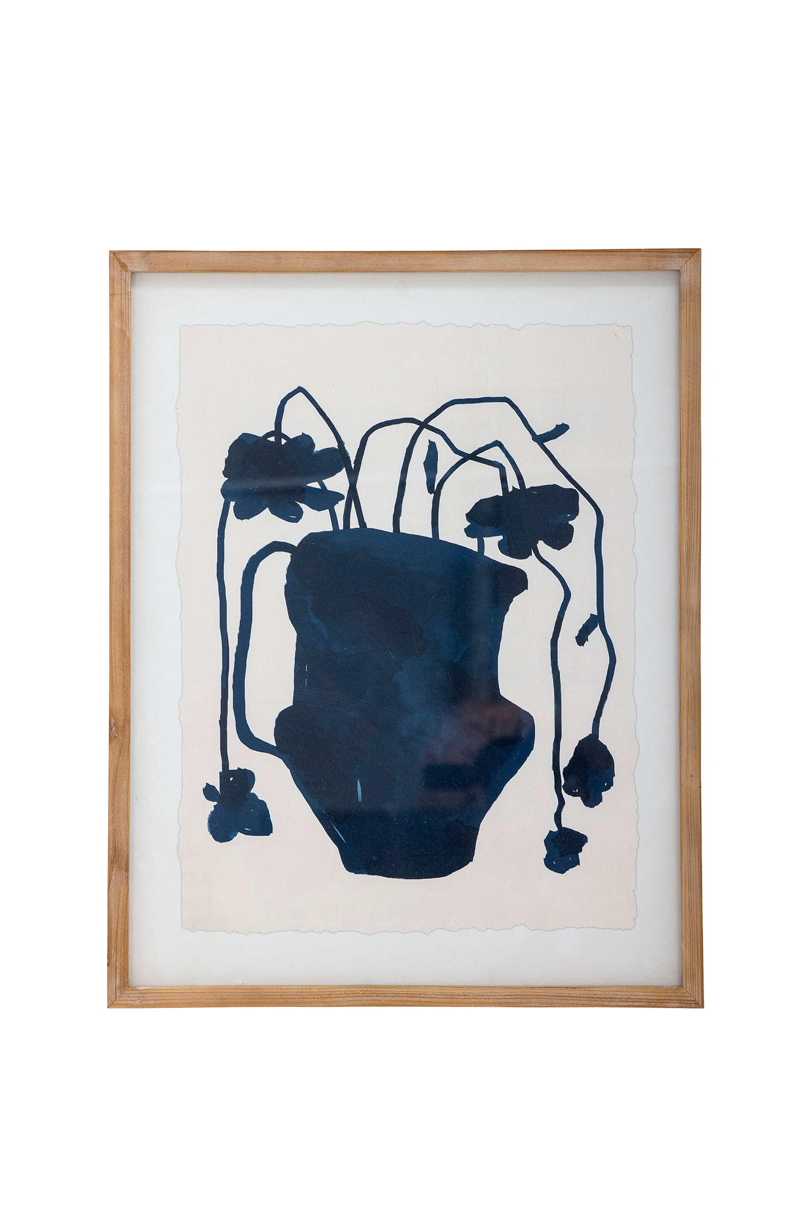 Veera illustration med ramme fra Bloomingville er en kunstnerisk plakat i smukke blå nuancer. Rammen er lavet af fyrretræ og har transparent glas, hvilket skaber et smukt udtryk.
