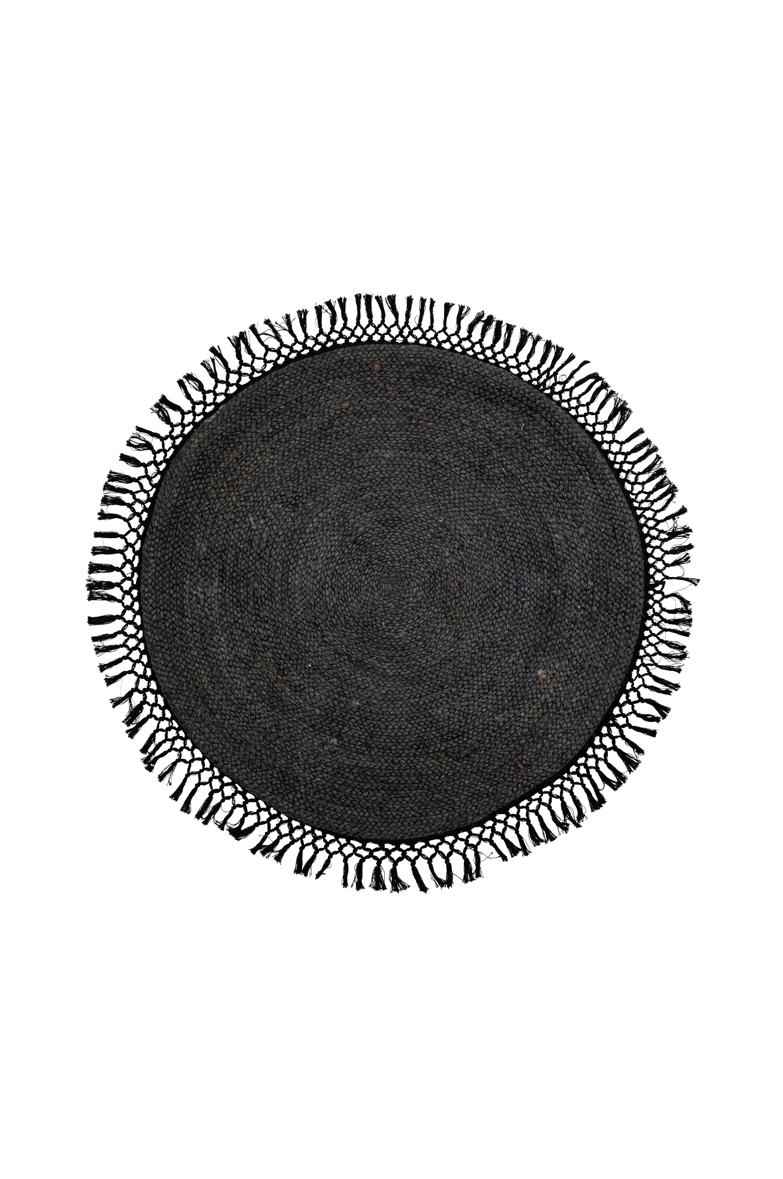 Rundt tæppe af sort jute, som gør et hvilket som helst rum i huset hyggeligt. Diameter 122 cm.
