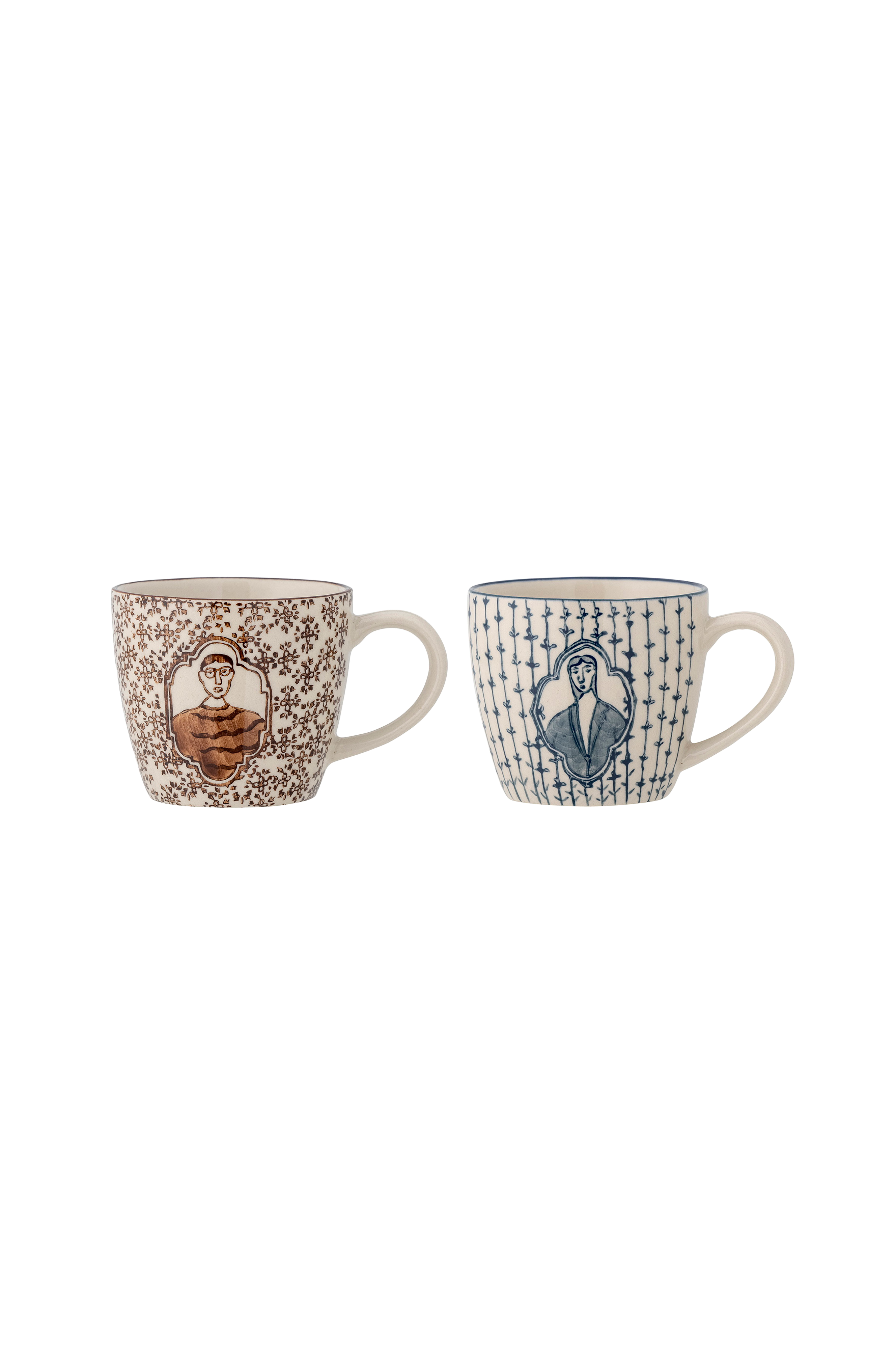 Tonia kop fra Bloomingville af stentøj, er et sæt med to kopper som er malede i hånden med et dekorativt mønster. Kopperne er perfekte for en god kop kaffe eller te. Hvert produkt er unikt, fordi de er dekoreret i hånden. Kopperne har blå og lila farve. Diameter 7,5 cm.