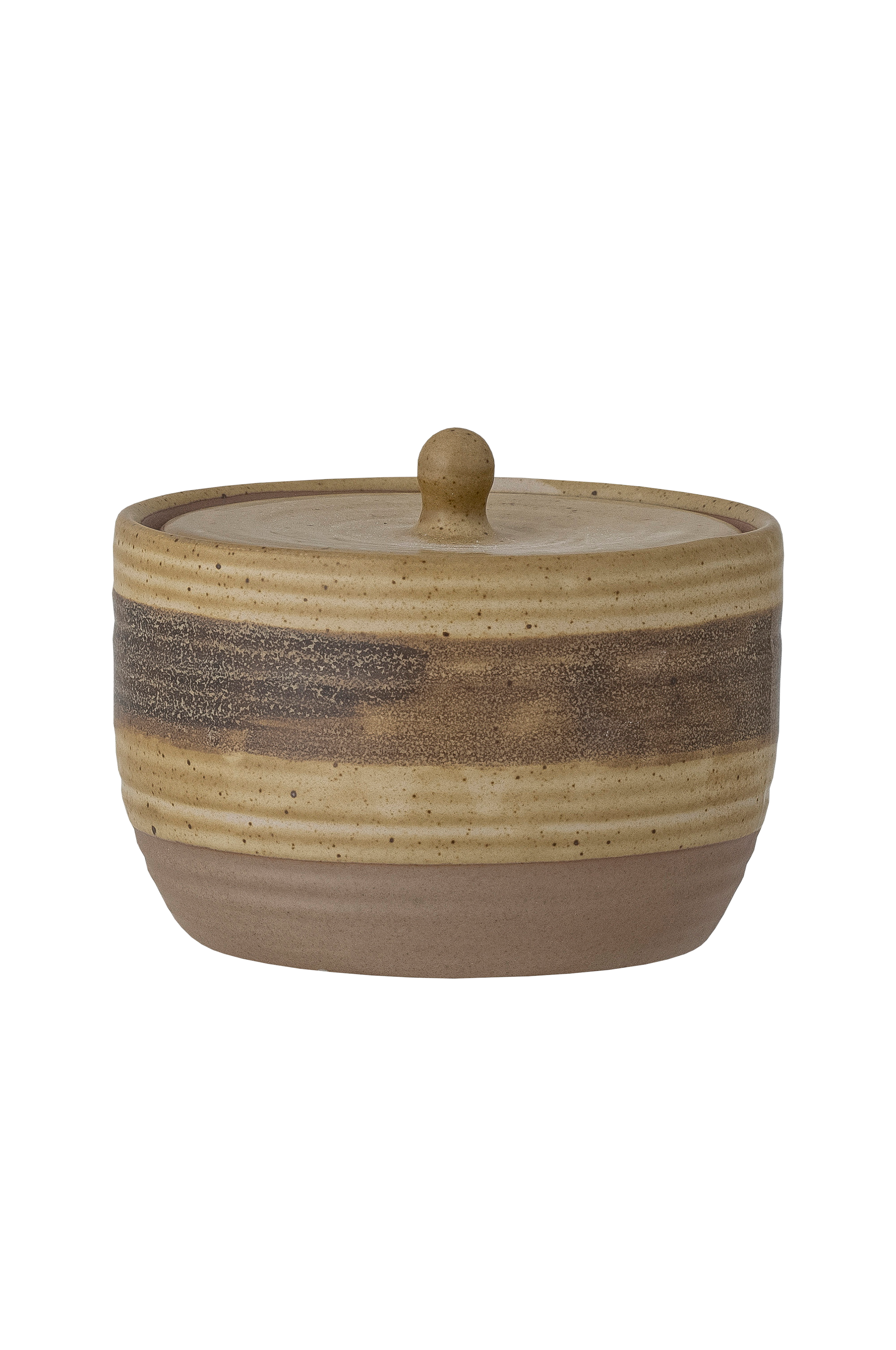 Krukke Solange med låg fra Bloomingville er en anderledes tilføjelse til køkkenet. Krukken er fremstillet af naturligt stentøj med en kunstnerisk stribe og designet minder om japansk keramik. Denne krukke er en unik genstand lavet i hånden og håndglaseret, så glasuren og mønsteret vil variere.