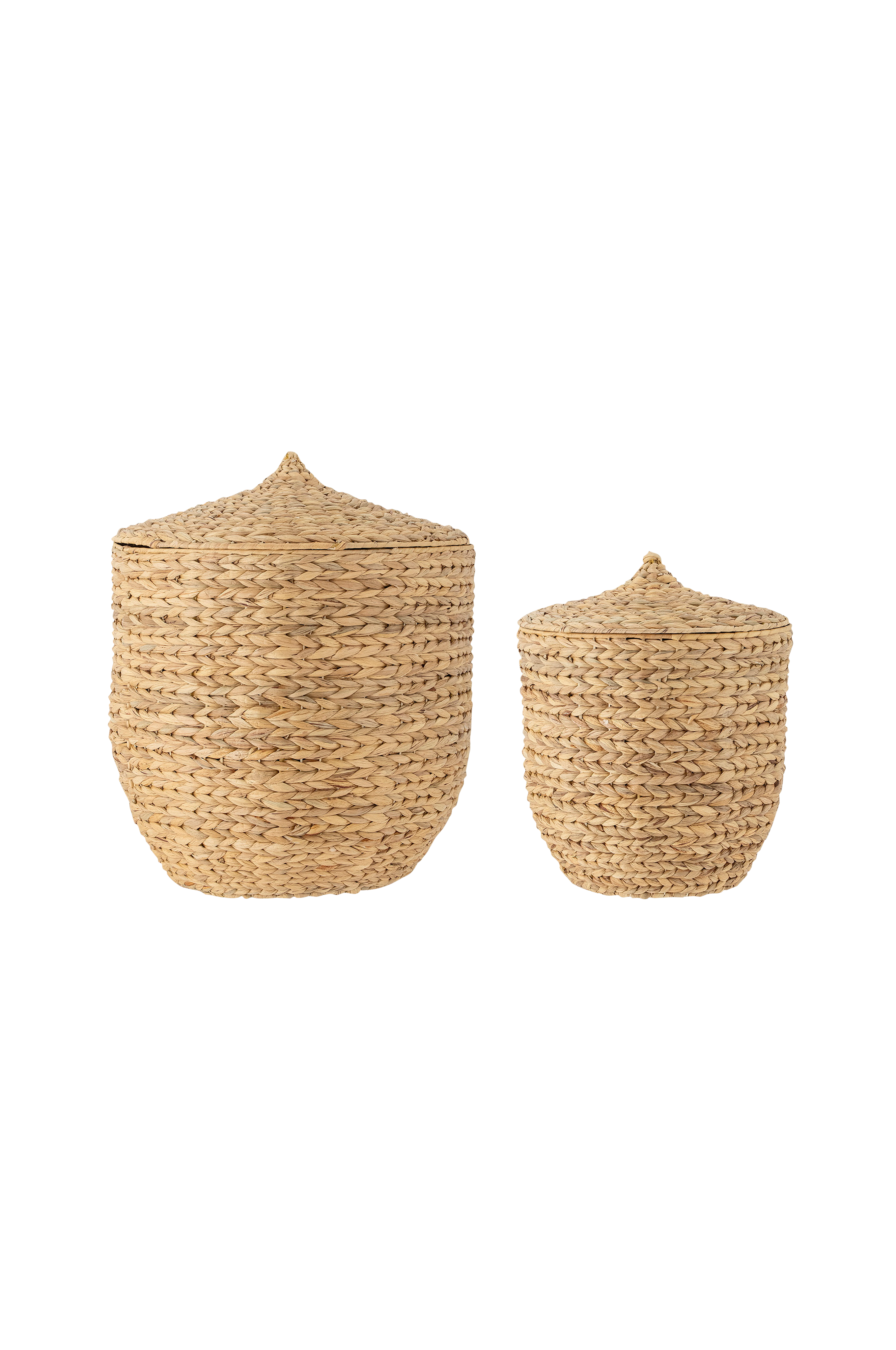 Dinan kurv med låg fra Bloomingville er et sæt med to vasketøjskurve med charmerende, spidse låg. En praktisk og flot opbevaringsløsning til vasketøjet. Kurvene er lavet af vandhyacint og er vævet i hånden. D35xH42/D47xH55 cm, 2 stk.