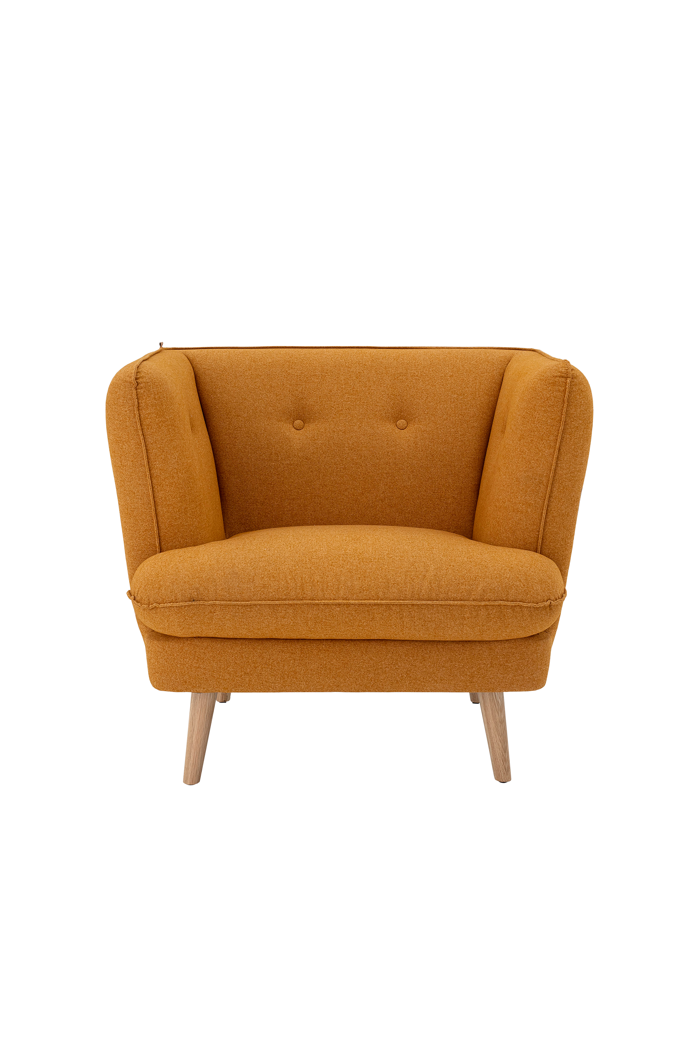 Lænestol med stel af plywood, polstret med polyester. Beklædt i polyesterstof. Ben af eg. Lettere samling.