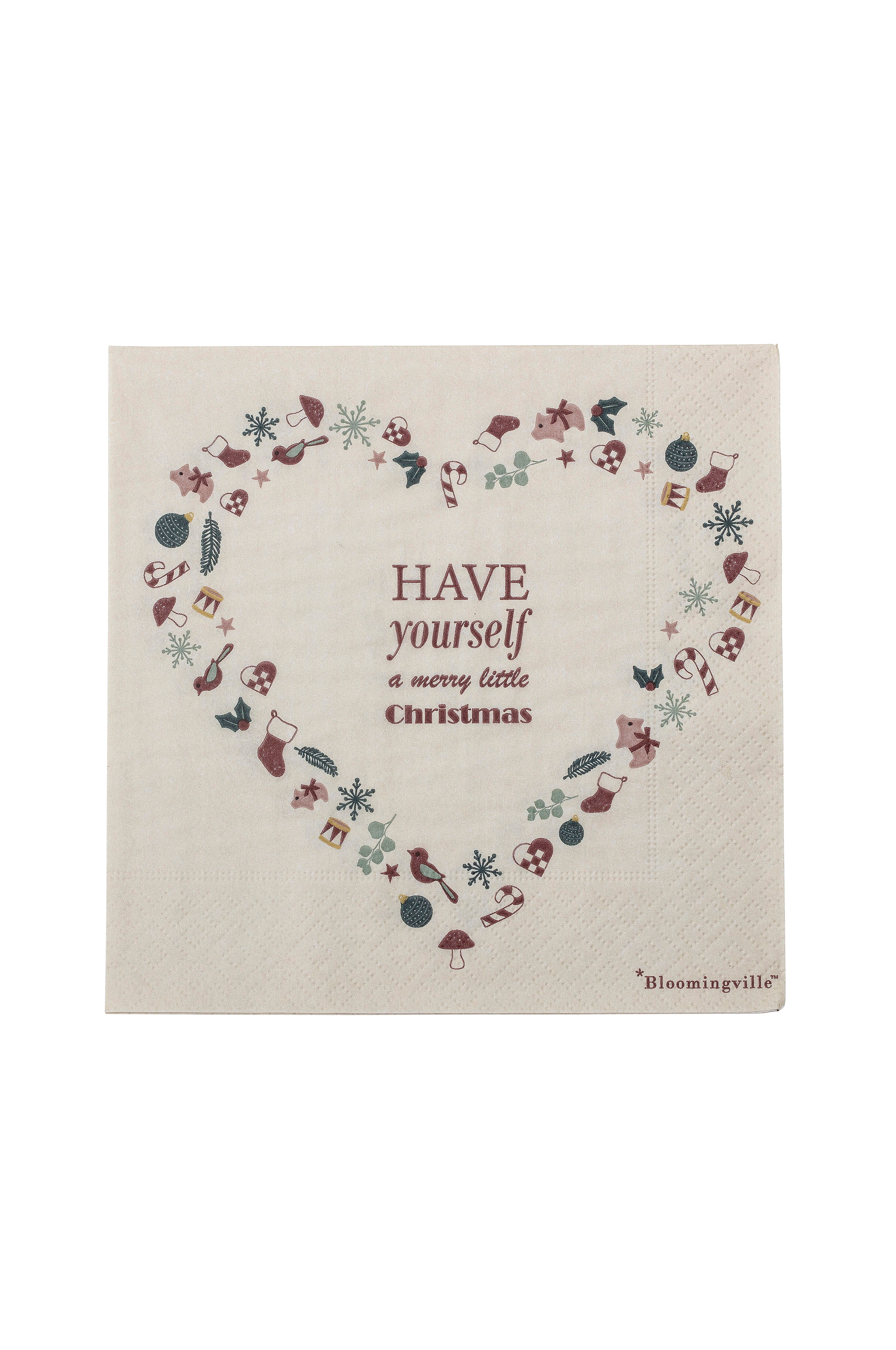 Paia servietter fra Bloomingville er det perfekte supplement til festlig borddækning. Servietterne er lavet af blødt papir med et smukt, hjerteformet julemønster og teksten "Have yourself a merry little Christmas" som skaber den helt rigtige julefølelse.