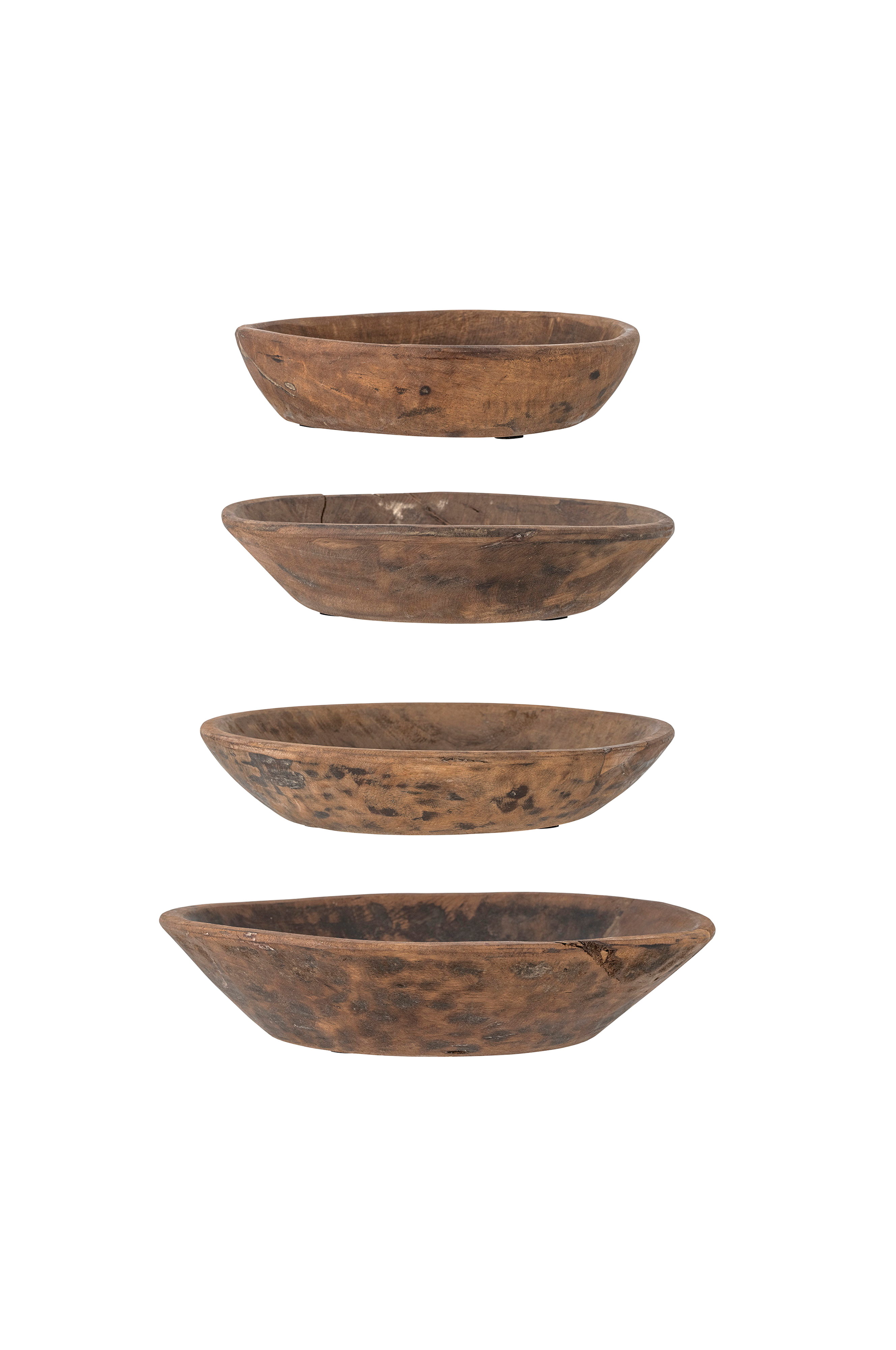 Gissel skål fra Creative Collection er et sæt med fire udtryksfulde skåle lavet af genbrugstræ i forskellige størrelser. I gamle dage blev skålene brugt i det indiske køkken til at opbevare mad inden tilberedning. I dag gør den rustikke vintagestil dem perfekte som dekoration. Mål: Diameter 17-46 cm, højde 10 cm, 4-pak
