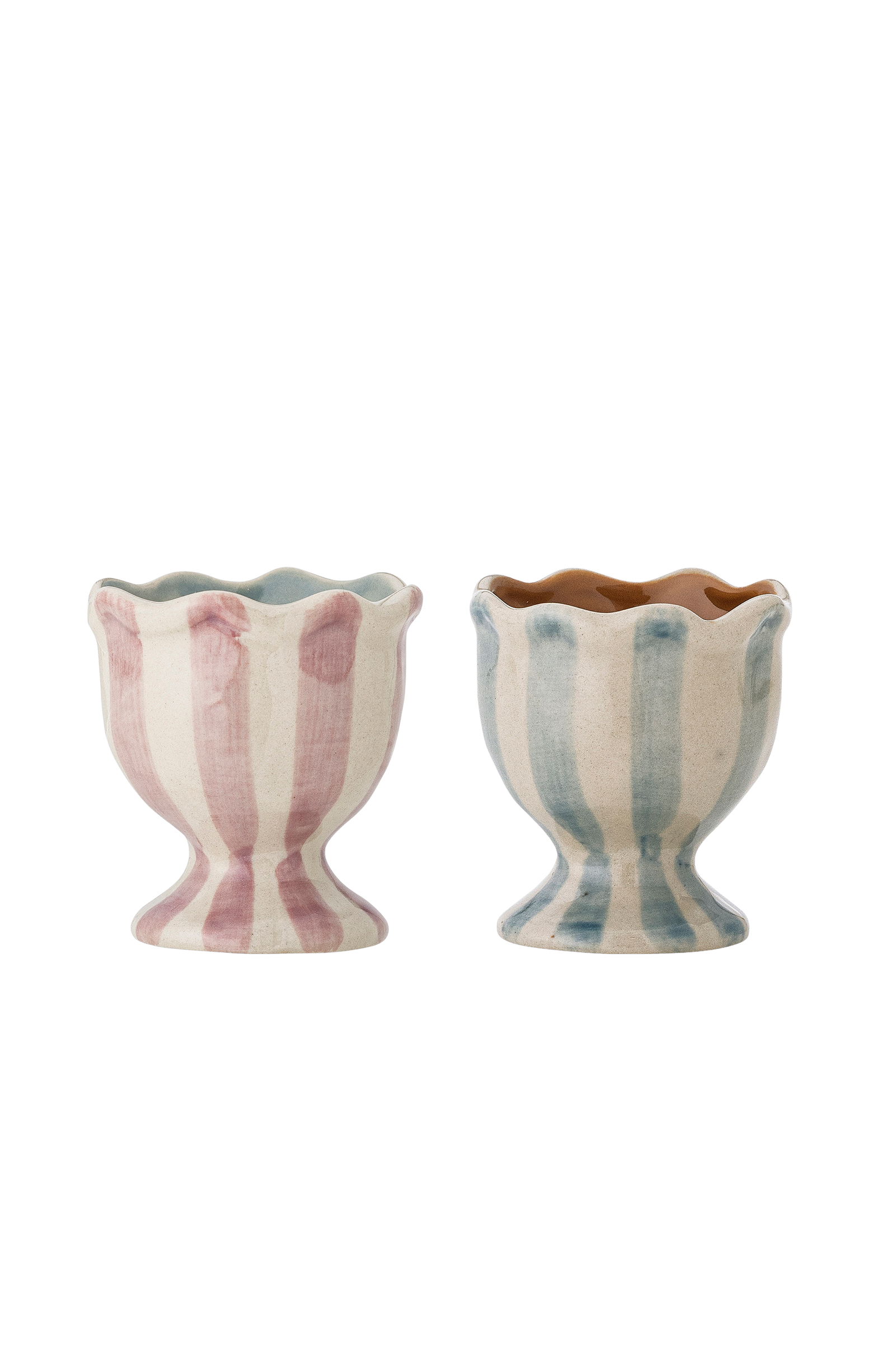 Villa-æggebægeret fra bloomingville er et sæt med to æggebægre fremstillet af stentøj. Begge æggebægre har en bølget kant og er håndmalede med stribede detaljer. Brug æggebægerne til at sætte et legende præg på dit morgenbord og få dem, der sidder omkring det, til at smile.