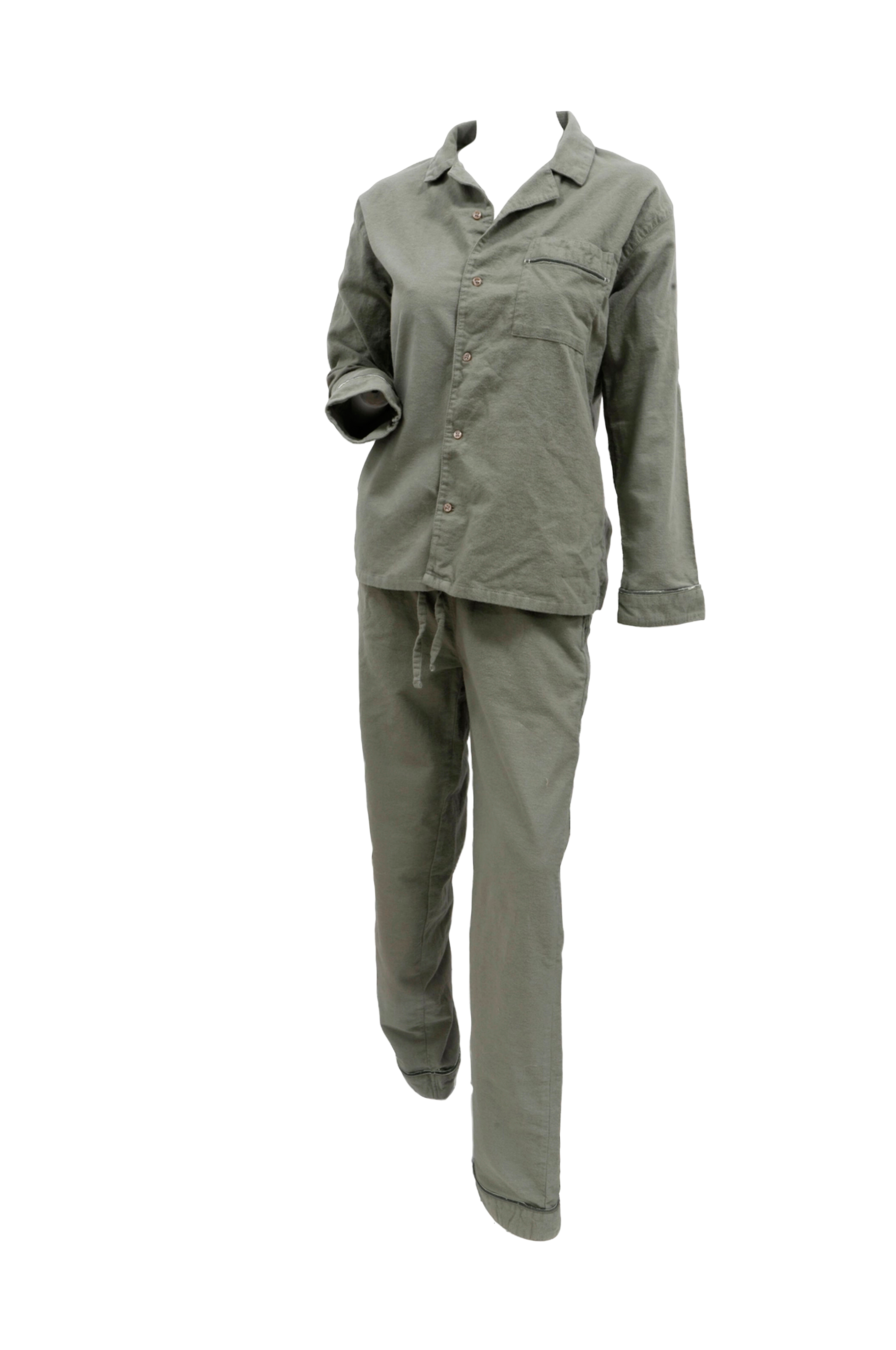 Forkæl dig selv med hverdagsluksus med den hyggelige oliver flannel-pyjamas i dejlige jordfarver. De giver en følelse af ægte komfort og varme, perfekt til at slappe af og nyde stille stunder derhjemme. Indhyllet i den bløde flannel kan du virkelig føle dig afslappet og godt tilpas, mens du tager dig tid til at nyde en varm kop te og sole dig i den ægte, hyggelige atmosfære. Fremstillet af 100 % bomuldsflonel. Sættet består af bukser og en skjorte med en brystlomme på skjorten og sidelommer på bukserne samt snøre i taljen på bukserne.