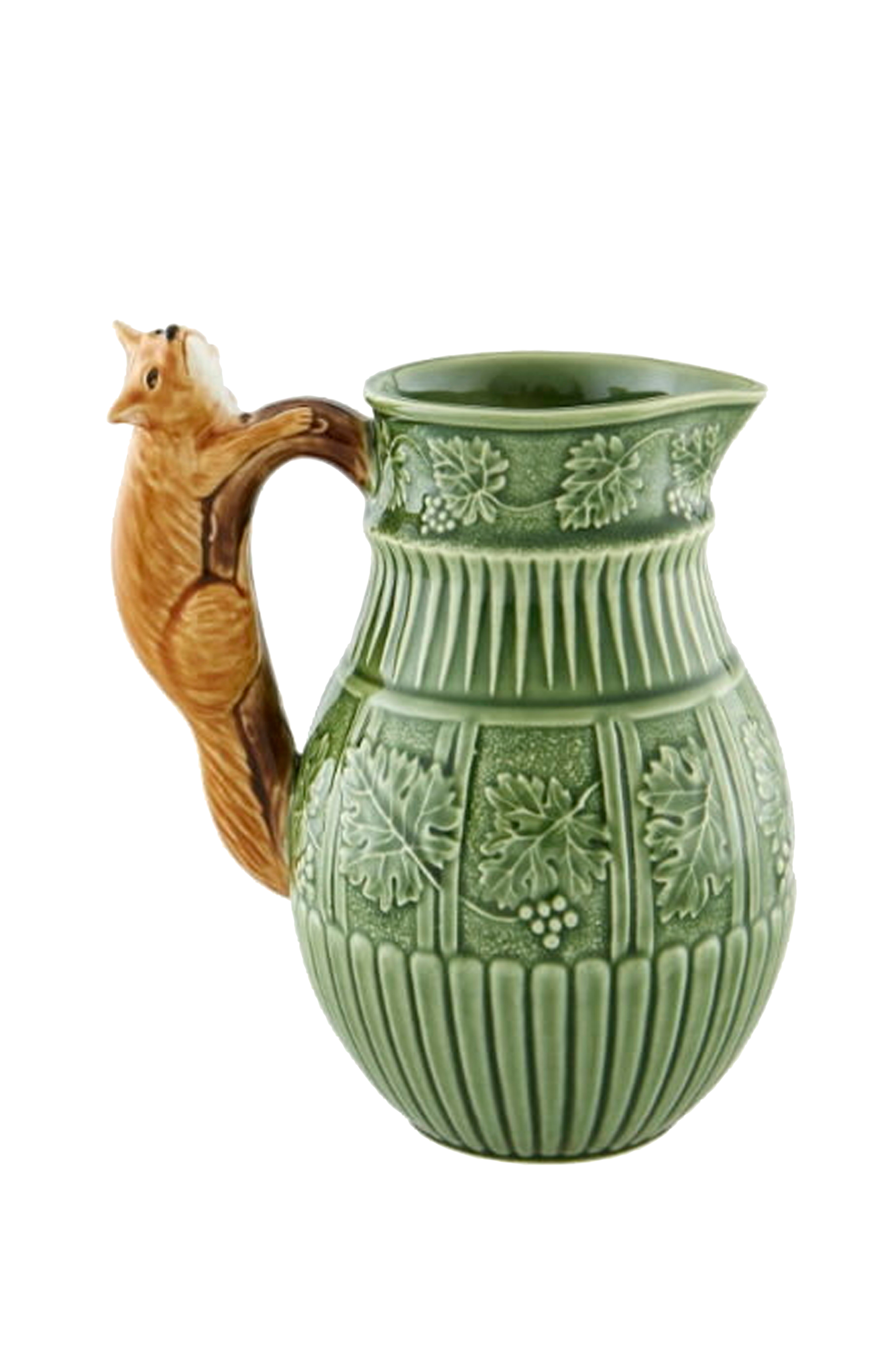 Kande af glaseret lertøj. Mål: Længde 18,5 cm, bredde 14 cm, højde 19,5 cm.