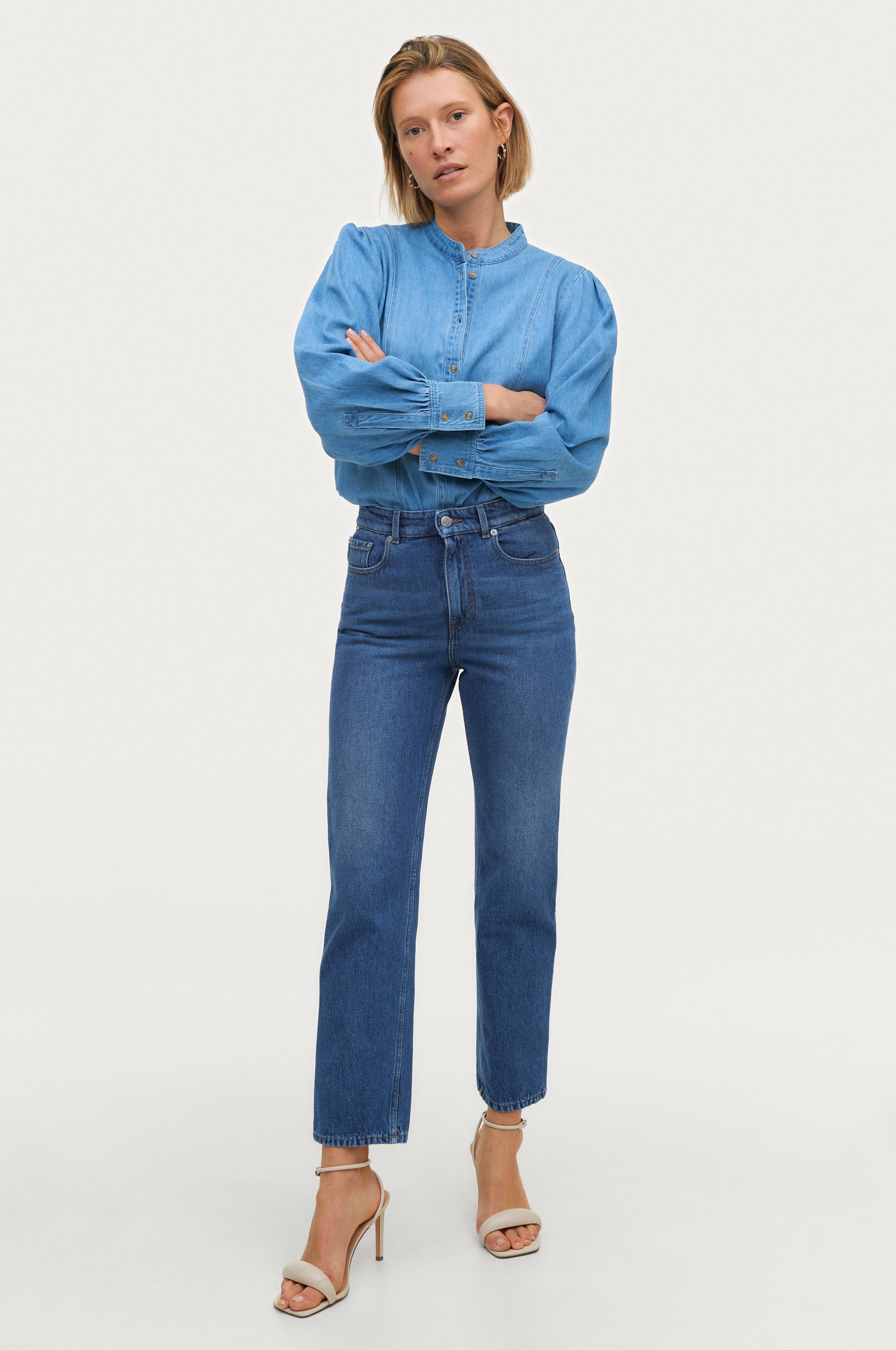 • Fremstillet af bomuldsdenim• Croppet model• Mediumhøj talje• Lige ben• Femlommemodel• Gylp med lynlås
