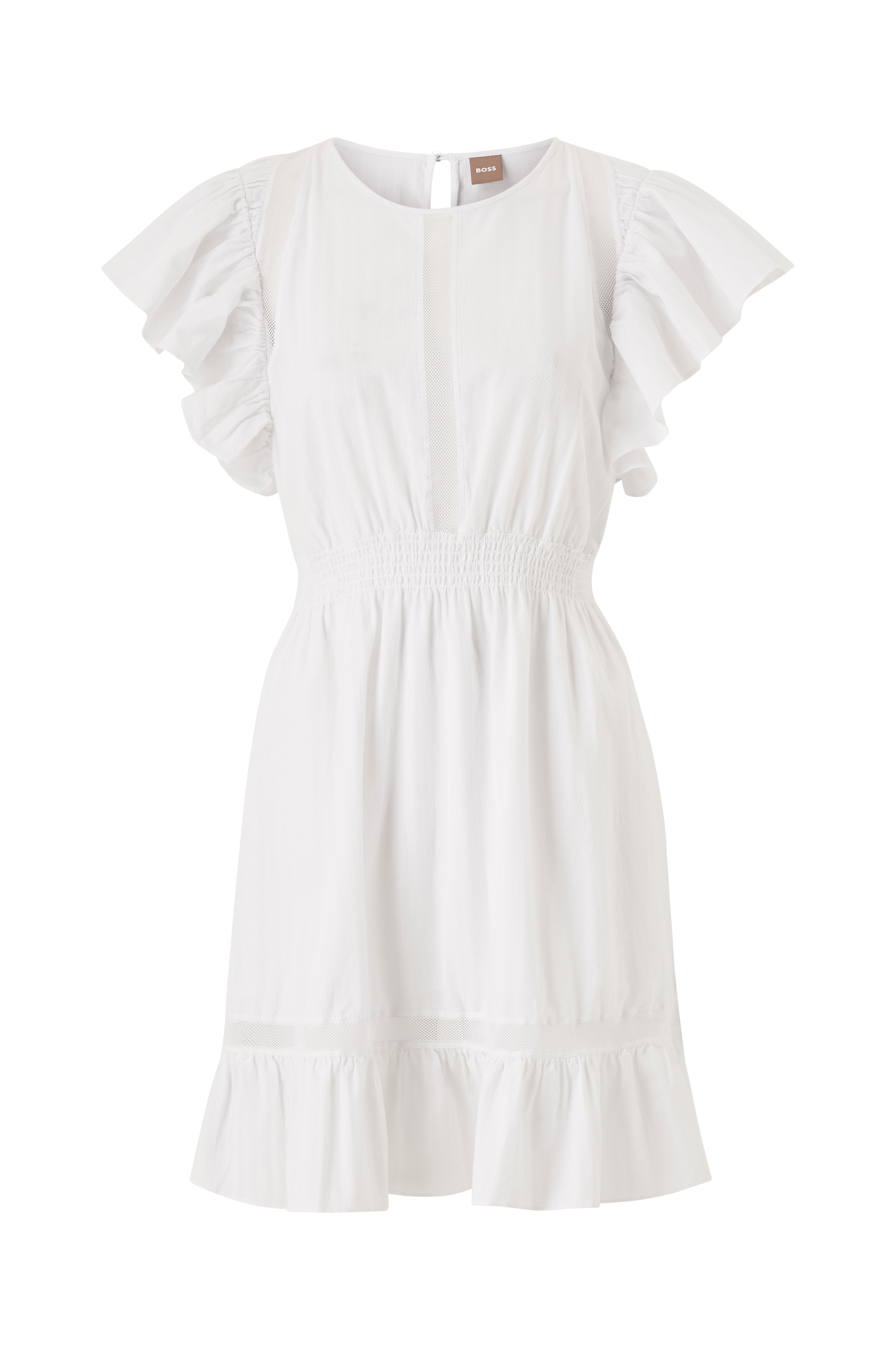 • Kort model med svaj• Korte flagrende ærmer• Ventilation med knap i nakken• Elastisk talje med smock• Volant nederst• Transparent panel i mesh oppe foran• Længde: 90 cm i størrelse 36