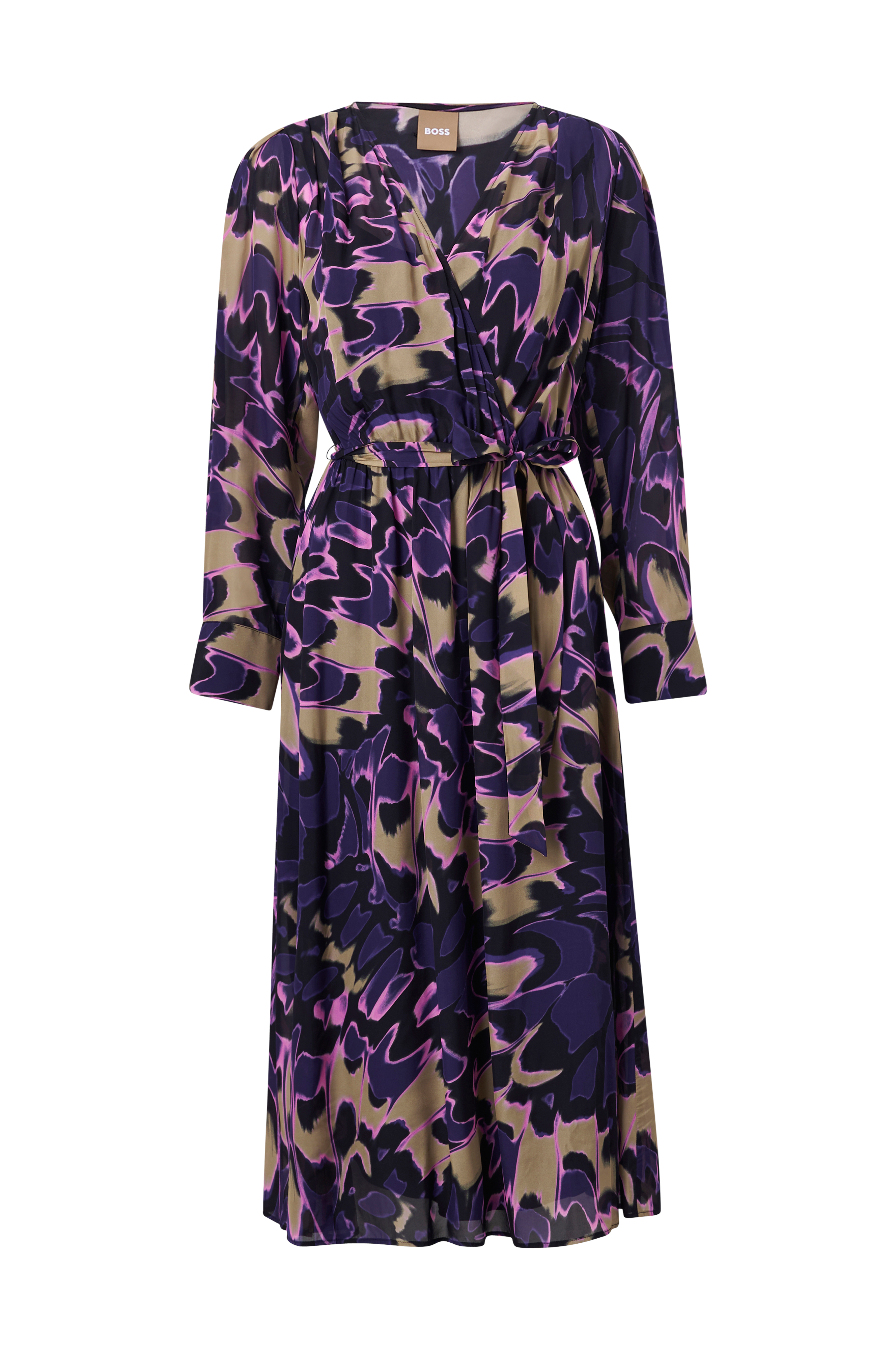 • Fremstillet af semitransparent chiffon med printet mønster• Vævet for• Slå-om design på toppen• Elastisk talje• En dekorativ knap ved manchetterne med skinnende sten• Aftageligt bæltespænde ved taljen• Længde: 123 cm i størrelse 36