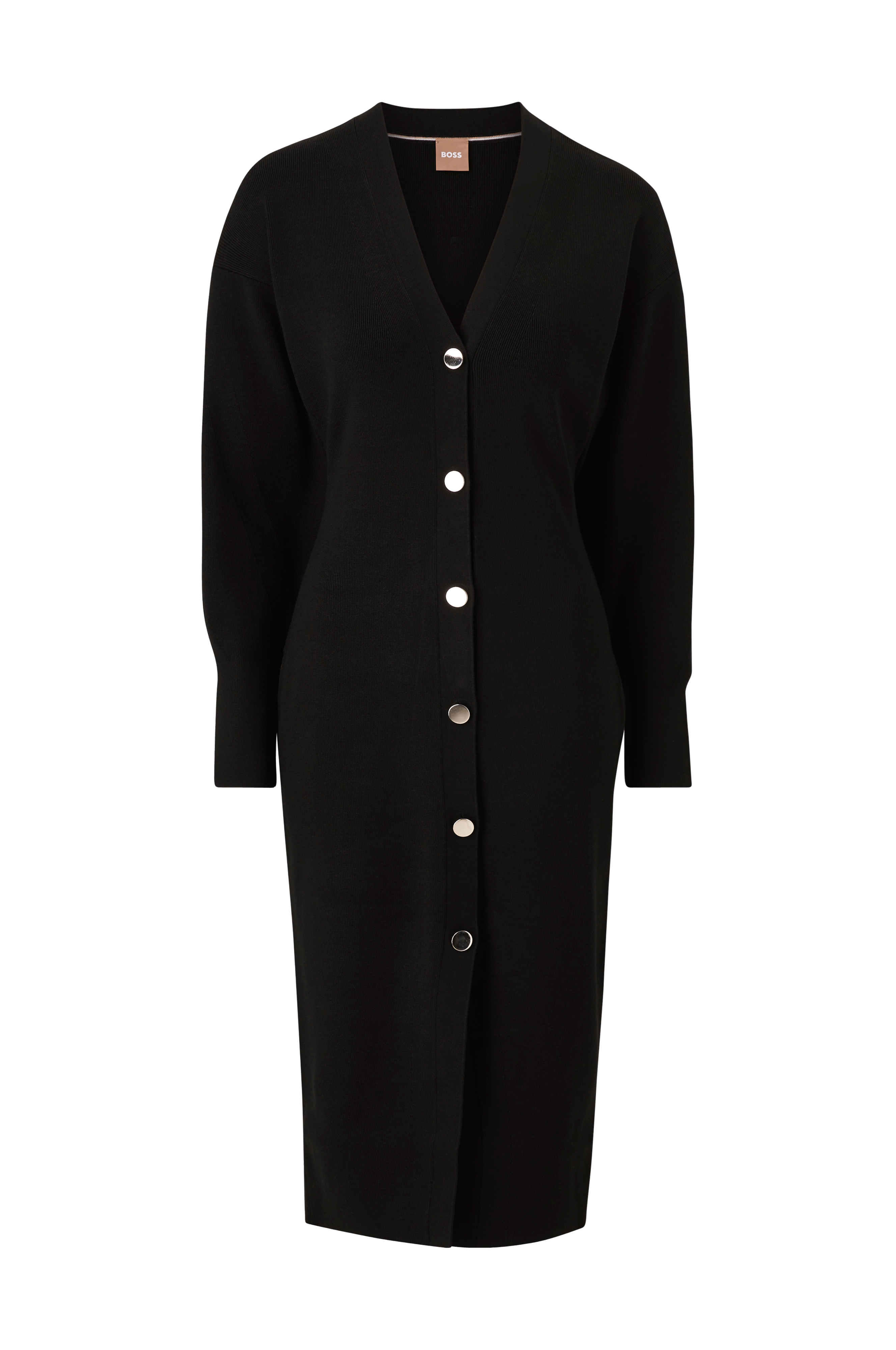 • Figurformede, fintstrikket model• V-formet halsudskæring• Knaplukning foran med sølvagtige knapper hele vejen frem• Langt ærme med ribstrik ved manchetterne• Længde: 115 cm i størrelse S