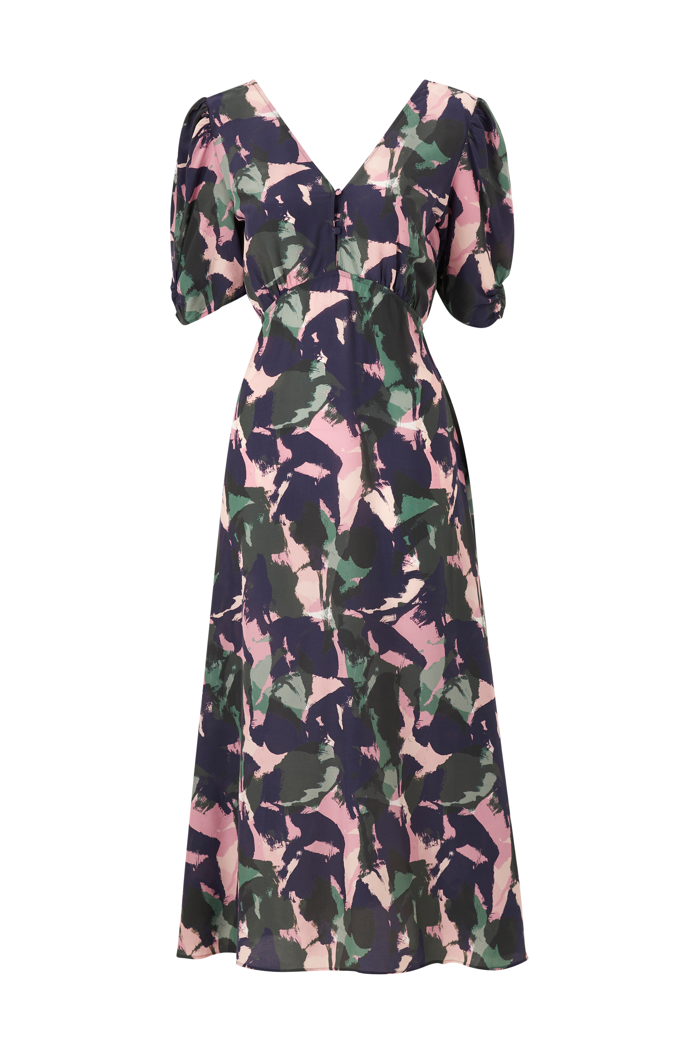 • Lang kjole i silkemiks• Elegant model med svaj• V-udskæring med knapper foran• Åbning med snøring i ryggen• Skjult lynlås i siden• Korte ballonærmer• Længde: 131 cm i størrelse 36