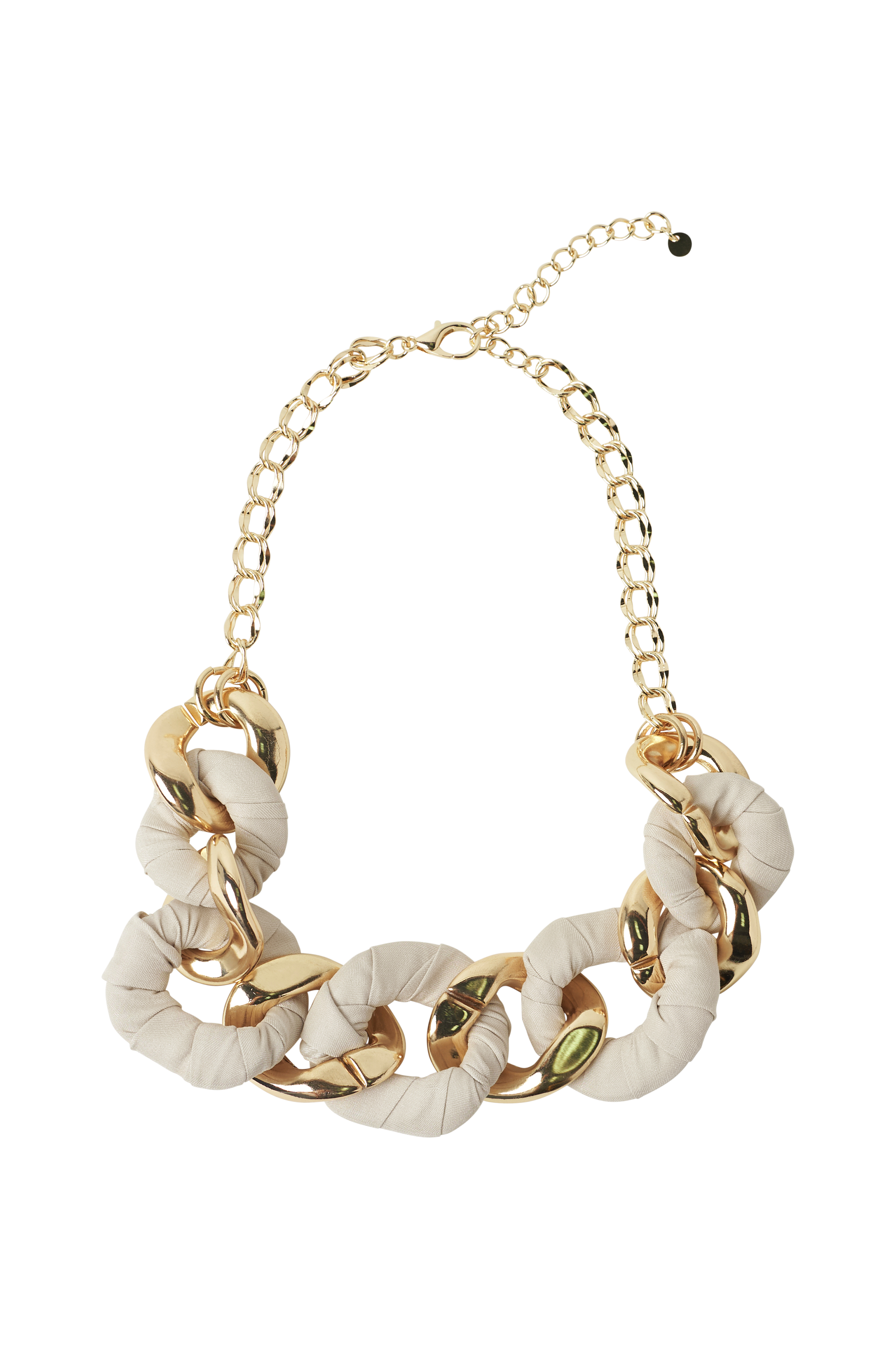 • Grov, guldfarvet kæde i plastik med detaljer i stof• Bredde 4 cm, længde 48 + 8 cm
