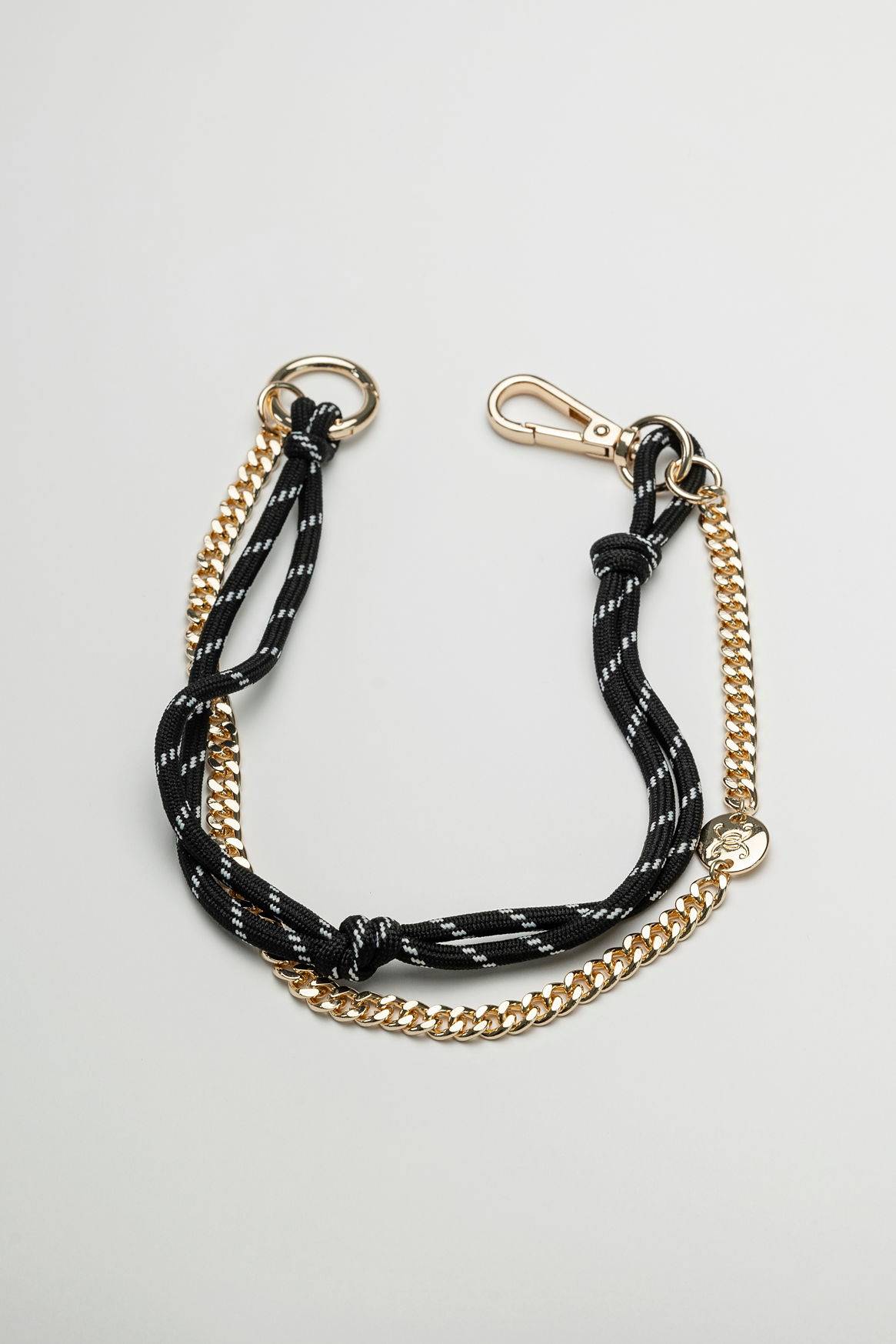 • En kæde i zink og jern med et vedhæng og en kæde i bomuld med knudedetaljer• Kan bruges som taskesmykke, halskæde eller til jeans