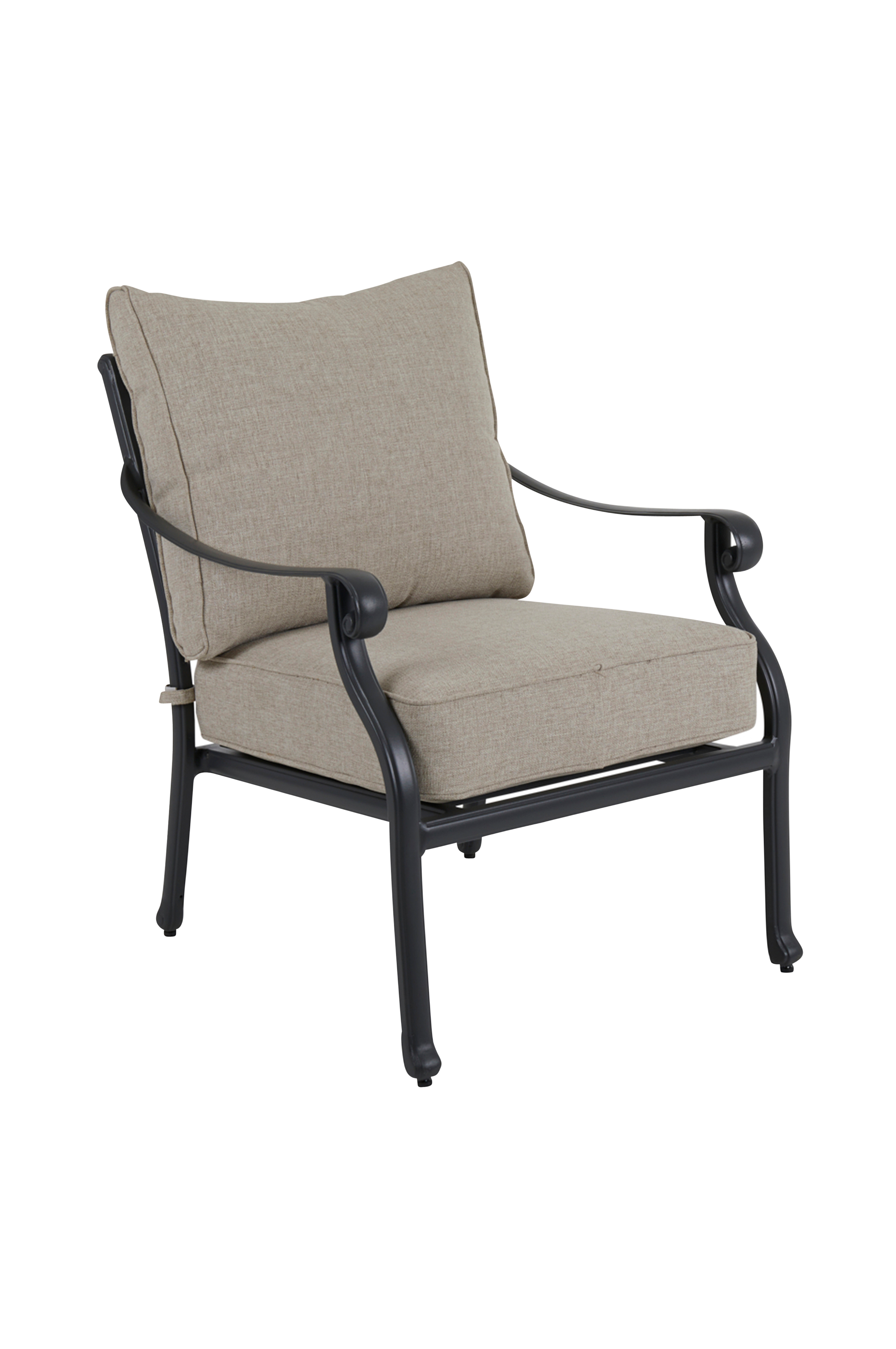 Tidløs lænestol i støbt aluminium som ikke ruster. Solide tykke hynder i olefinstof for bedste komfort. Lettere samling.