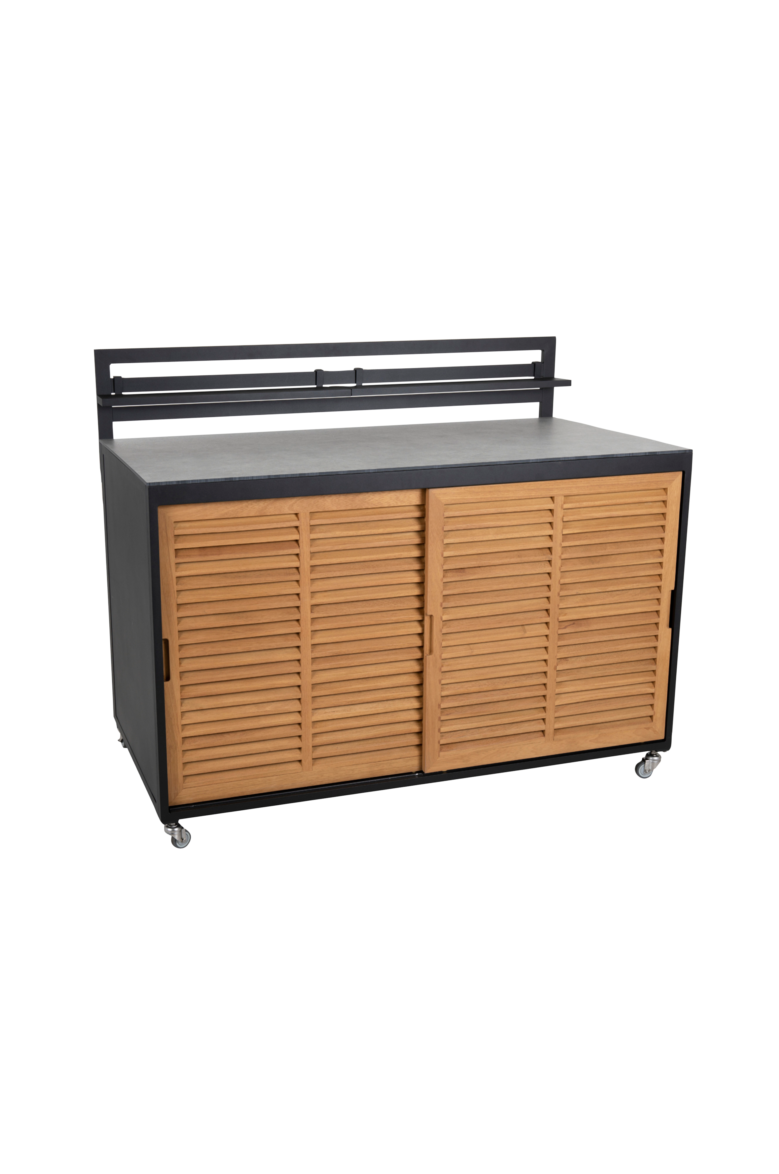 Udekøkken i sort aluminium og låger i teak. Top i højtrykslaminat. Udstyret med hjul, så den er let at flytte rundt.