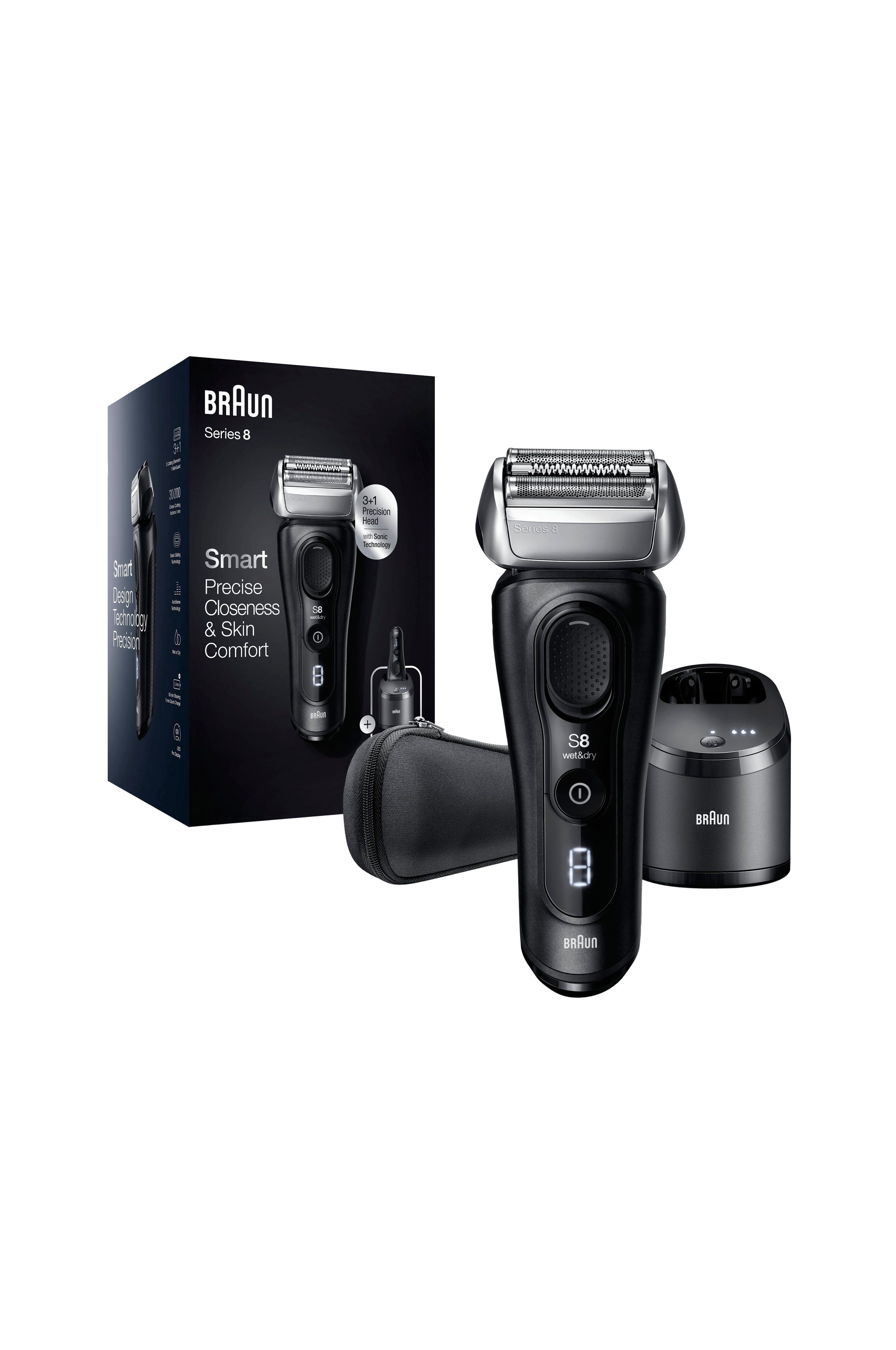 Velkommen til næste niveau inden for barbering med Braun Series 8, en elektrisk barbermaskine til mænd, der er både effektiv og nænsom i hvert eneste strøg. Med Brauns unikke soniske teknologi, der bruger 10.000 mikrovibrationer for at hjælpe med at fange flere hår med nænsomt glid på huden. Den elektrisk barbermaskine har et 40° bevægeligt hoved, der tilpasser sig ansigtetes konturer og sikrer en glat barbering selv på vanskelige områder. 5-i-1 SmartCare-center som får barbermaskinen til at føles som ny, hver dag.