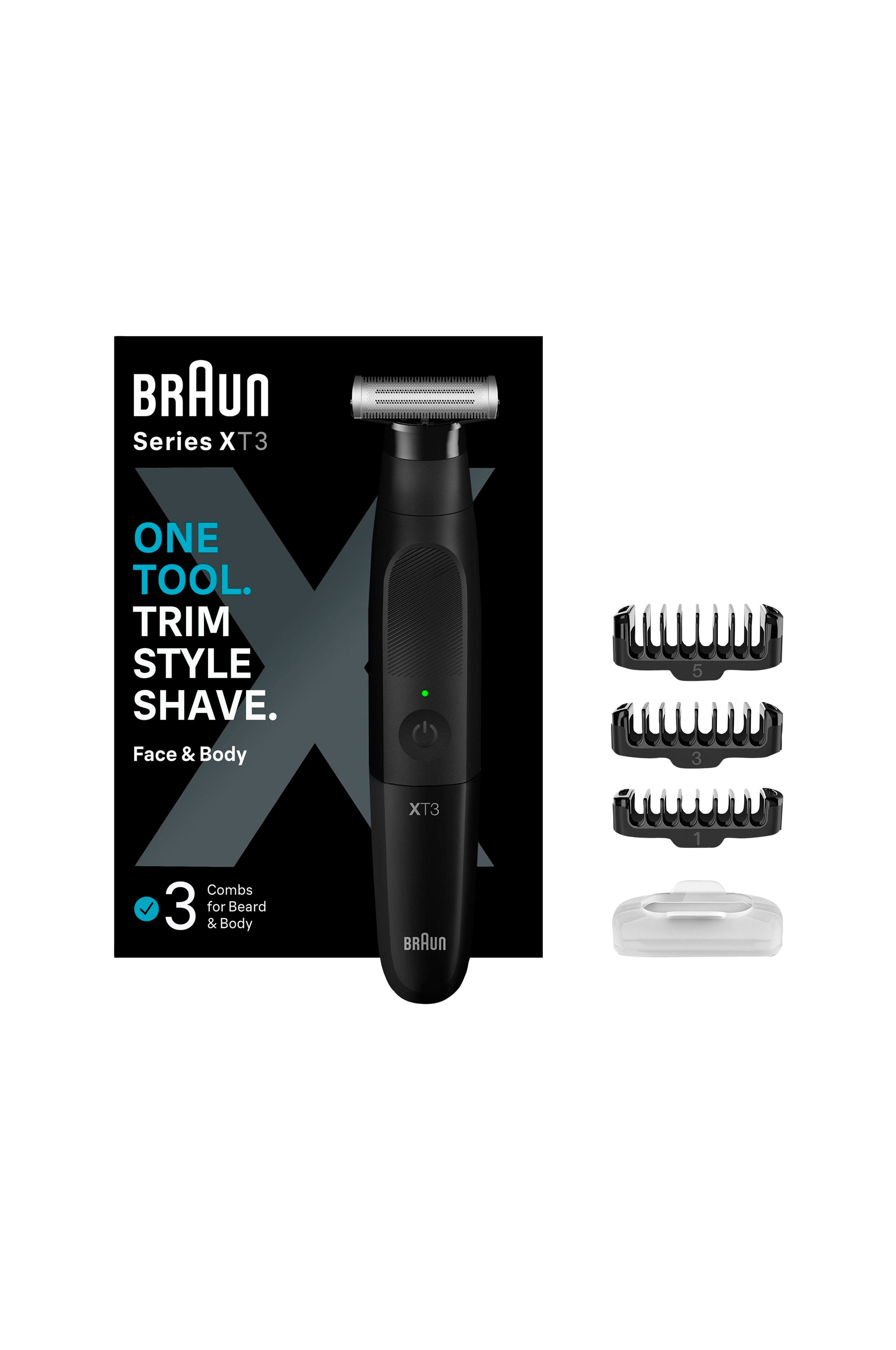 Trim dit skæg effektivt med Braun Series X, XT3100. Dette alsidige grooming-værktøj kombinerer trimning, styling og barbering med præcision. 4D-bladet, nu med et 2 x bredere skæreområde, udfører 450 bevægelser i sekundet for en hurtig plejeoplevelse. Bladene i rustfrit stål forbliver skarpe i op til seks måneder. Opnå fejlfri resultater med det fleksible Flex Head og tovejskamme, der er perfekte selv til vanskelige områder. SkinGuard-kammen og -bladet er skånsomme mod huden og giver beskyttelse. Apparatet er helt vandtæt, har et skridsikkert greb og kan bruges uden ledning i 45 minutter. Leveres med en praktisk opbevaringspose.