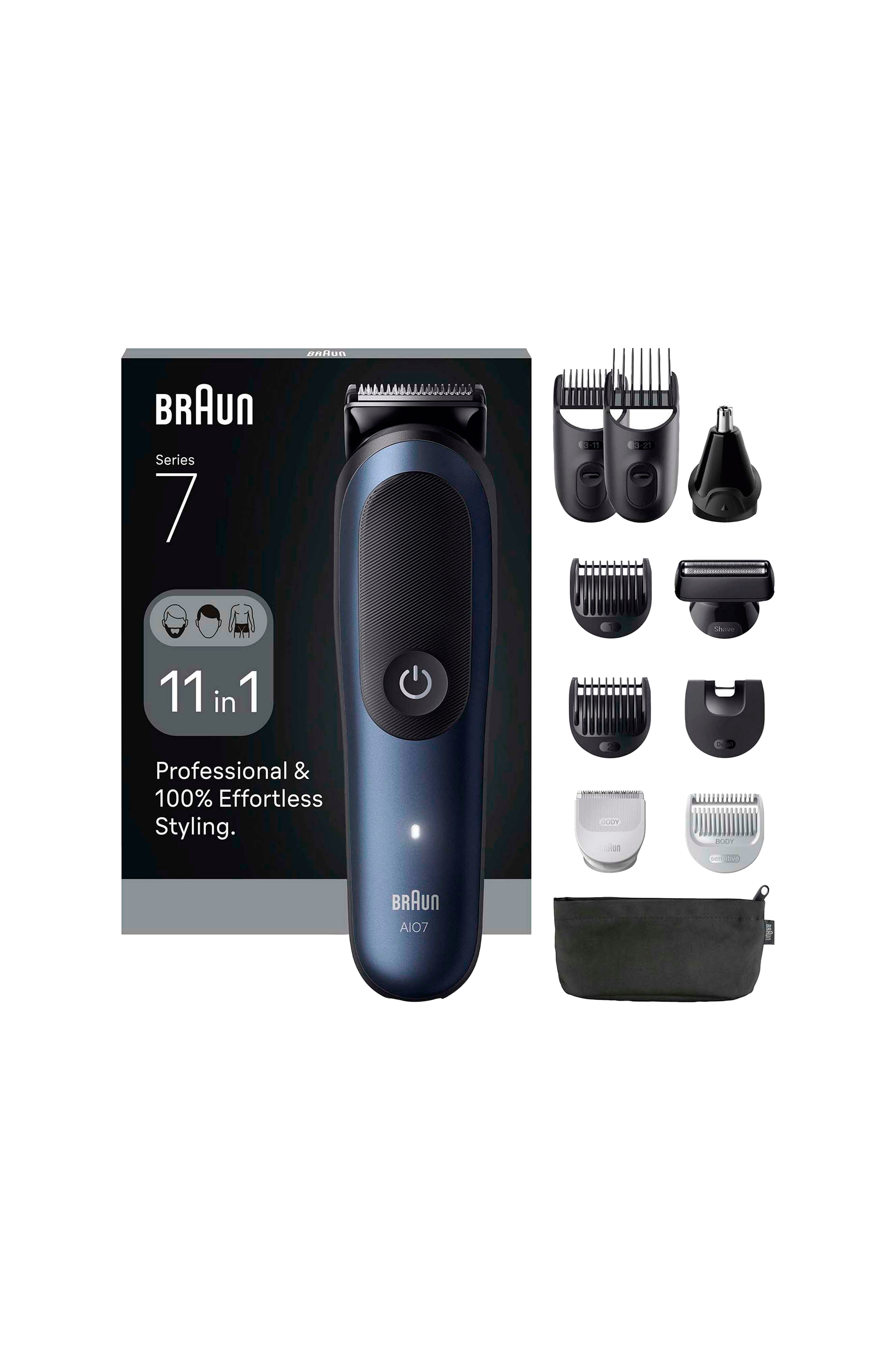 • Indeholder 1 trimmer, 6 kamme, 3 redskaber, 1 rengøringsbørste, 1 etui.