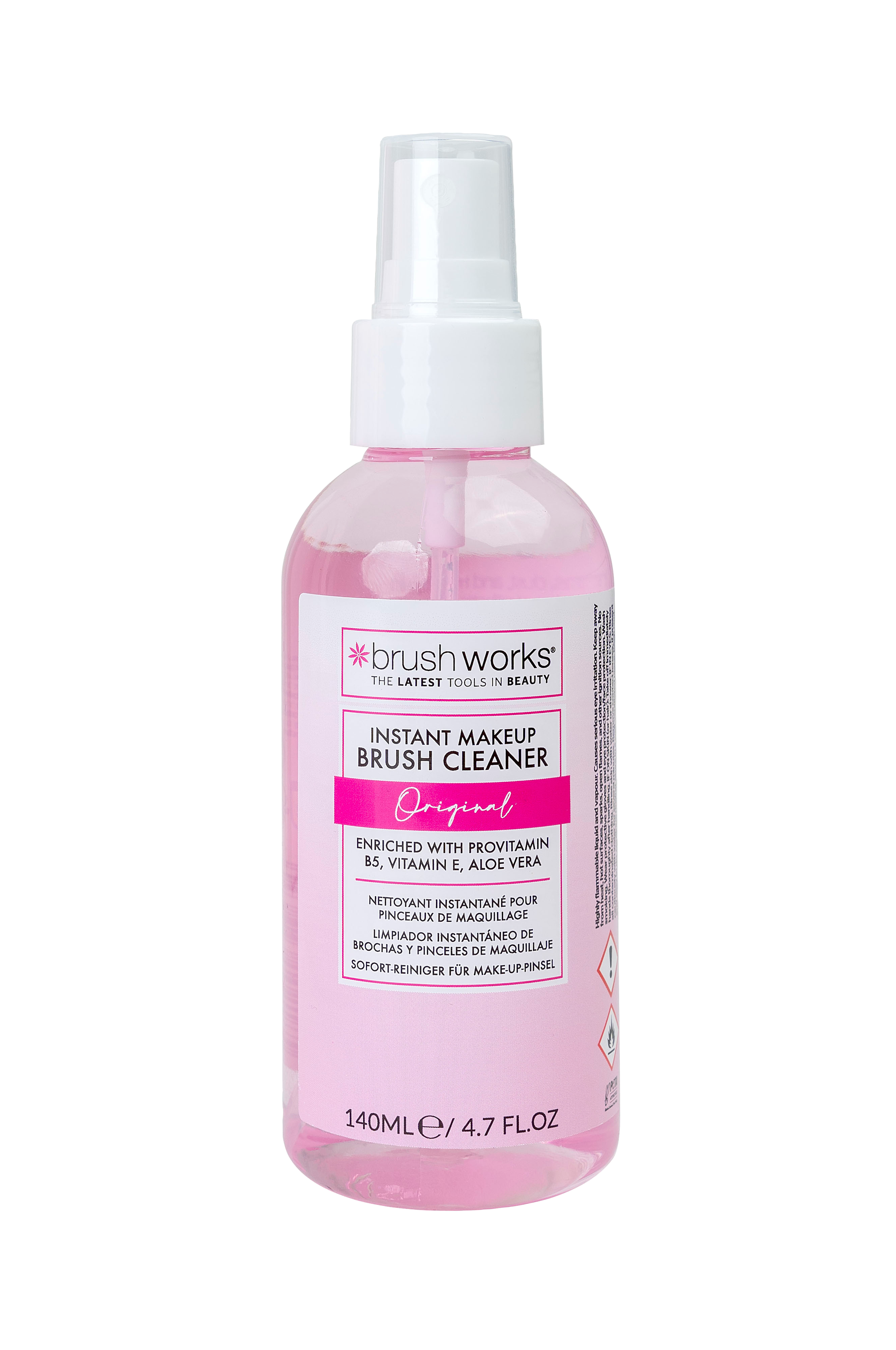 En hurtig og effektiv makeupbørste-rens, beriget med E-vitamin, Aloe Vera og Pro Vitamin B5, der ubesværet renser og fjerner bakterier, støv og makeup på få sekunder og holder børstehårene i optimal stand. Velegnet til syntetiske makeupbørster.