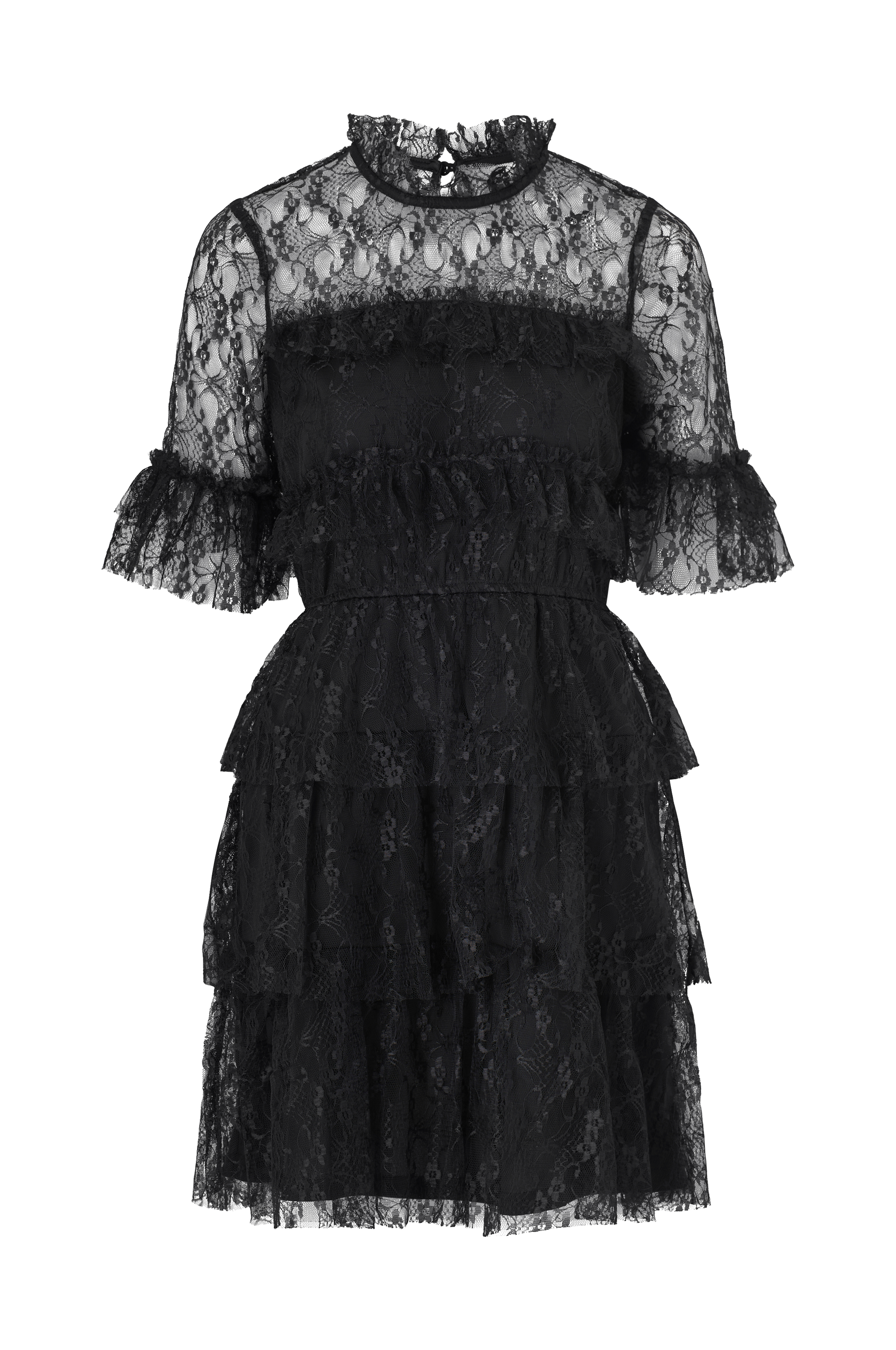 • Foret blondekjole i blød kvalitet• Rund, høj halsudskæring• Ventilation med knap i nakken• Elastik ved taljen• Blondevolanter på skørtet• Halvlange, uforede ærmer med blondevolanter ved ærmeafslutningerne• Længde: 92 cm i størrelse 36