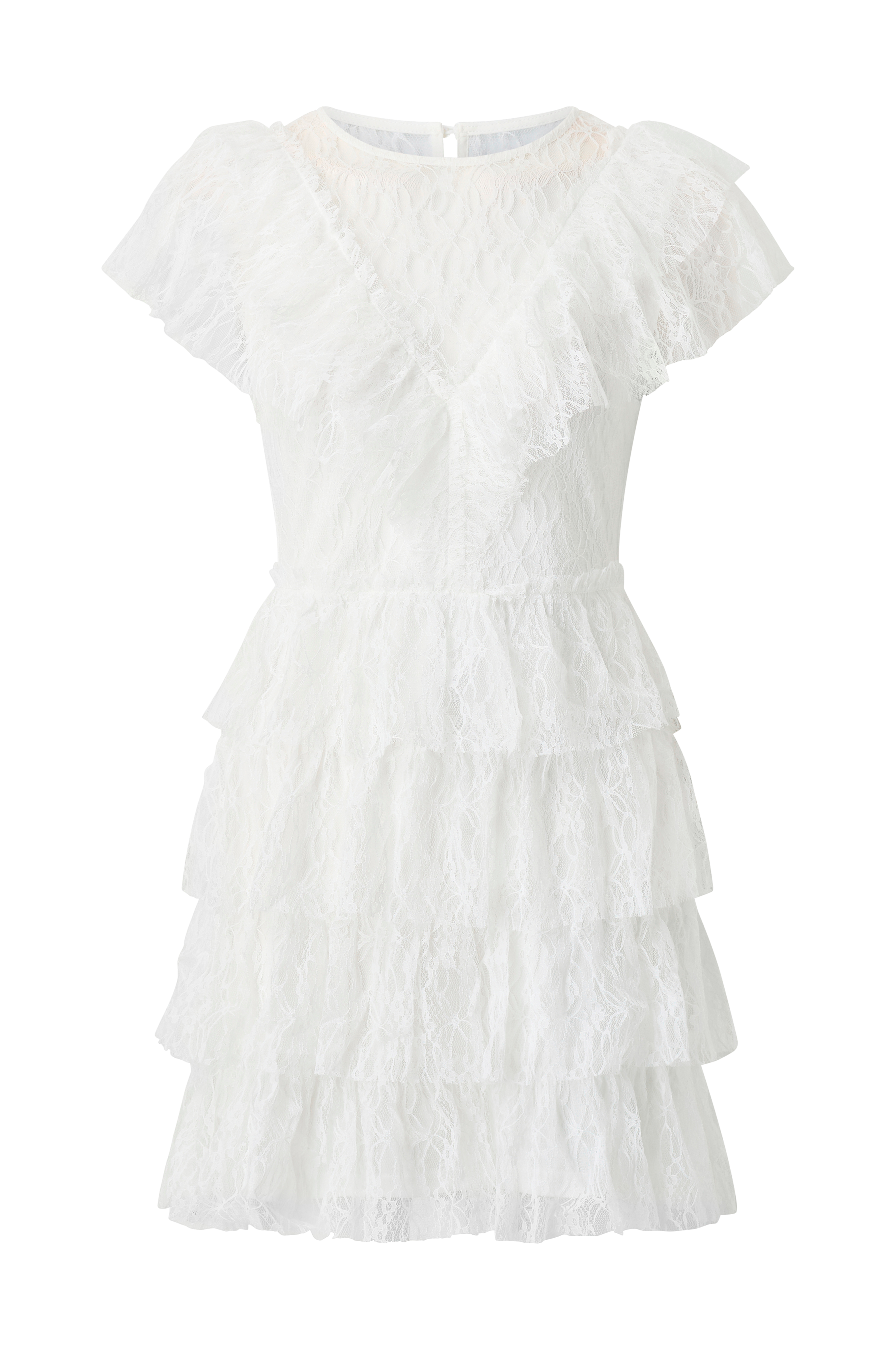 • Foret blondekjole• Rund halsudskæring• Perleknaper bagpå• Lynlåslukning i ryggen• Blondevolanter på skørtet• Halvlange, uforede ærmer med blondevolanter ved ærmeafslutningerne• Længde: 87 cm i størrelse 36
