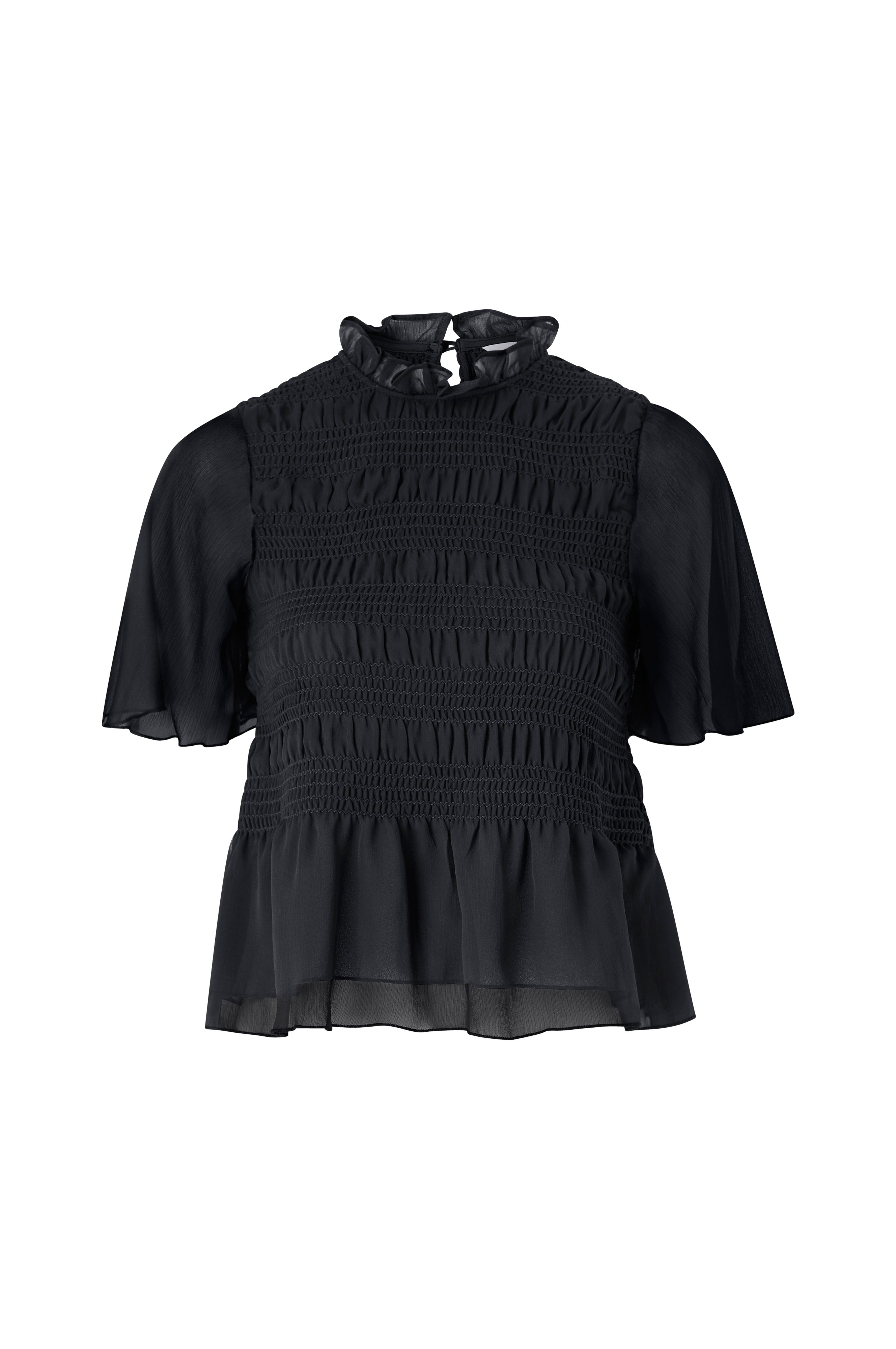 • Foret bluse i chiffon med en smock og korte sommerfugleærmer• Rund halsudskæring med flæsekrave• Nøglehulsåbning med knap i nakken• For i chiffon