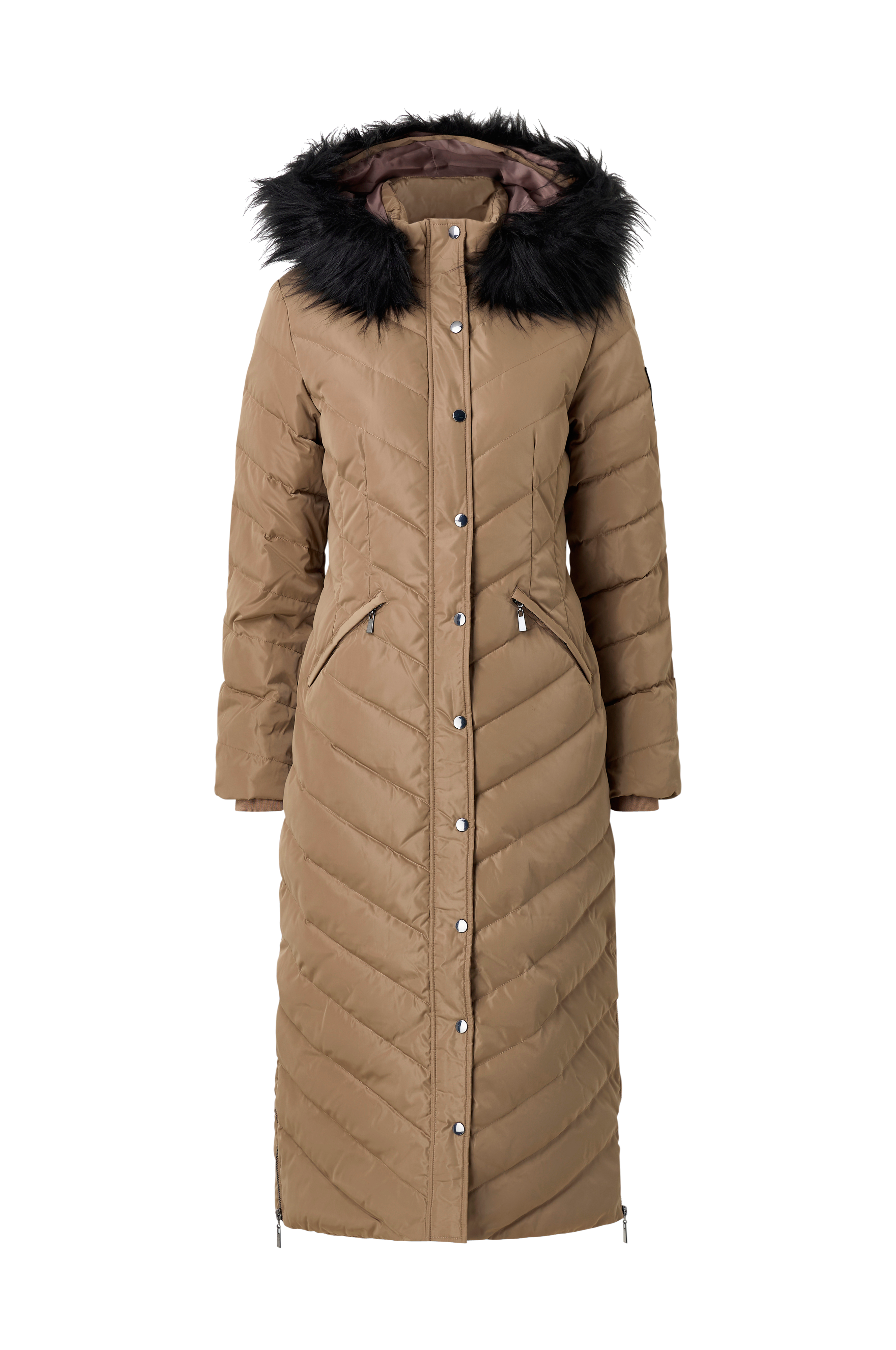 • Quiltet, foret frakke med fyld i dun- og fjerblanding • Fast hætte med aftagelig kunstpelskant • Ribmanchetter ved manchetterne • To-vejs lynlås • Vindflap over lynlåsen • Tekstilforing • En inderlomme • To udvendige lynlåslommer • Lynlåse nede i siderne • Længde: 119 cm i størrelse 36