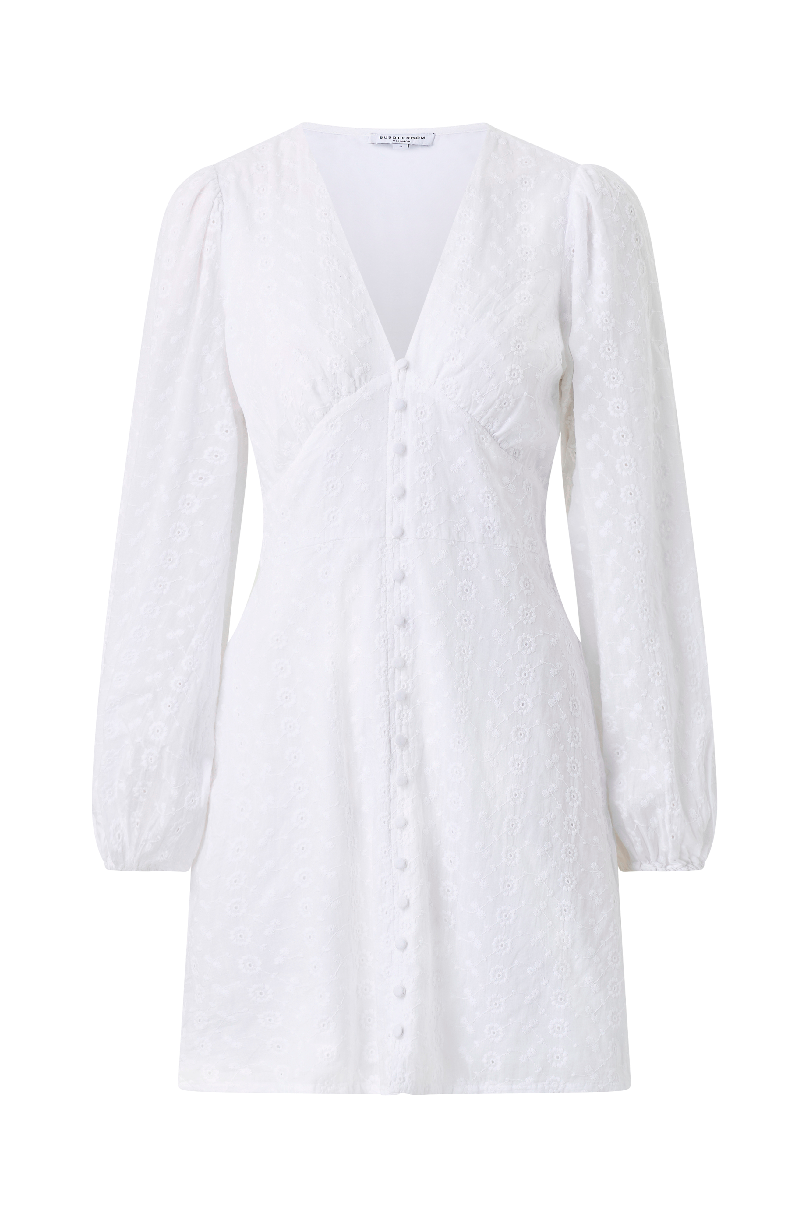 • Hulbroderet kjole med tekstilforing• V-udskæring• Lange ballonærmer• Falsk knappelukning foran• Længde: 87 cm i størrelse S