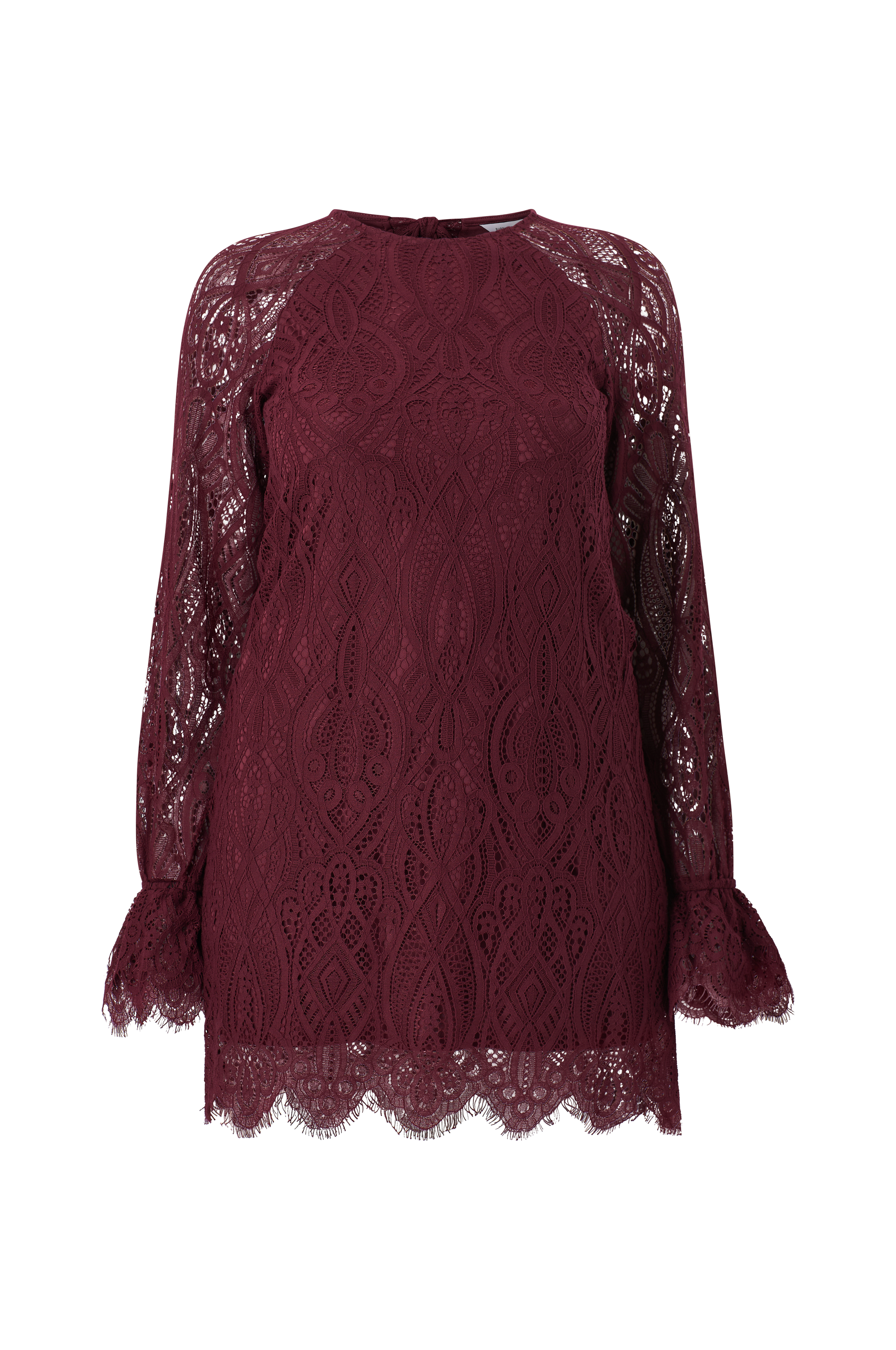 • Hulmønstret kjole• Rund halsudskæring• Åbning i ryggen med bindebånd på toppen• Lange raglanærmer• Elastiske ærmeafslutninger med dekorativ volant• Tekstilforing• Bølget søm• Længde: 97 cm i størrelse S