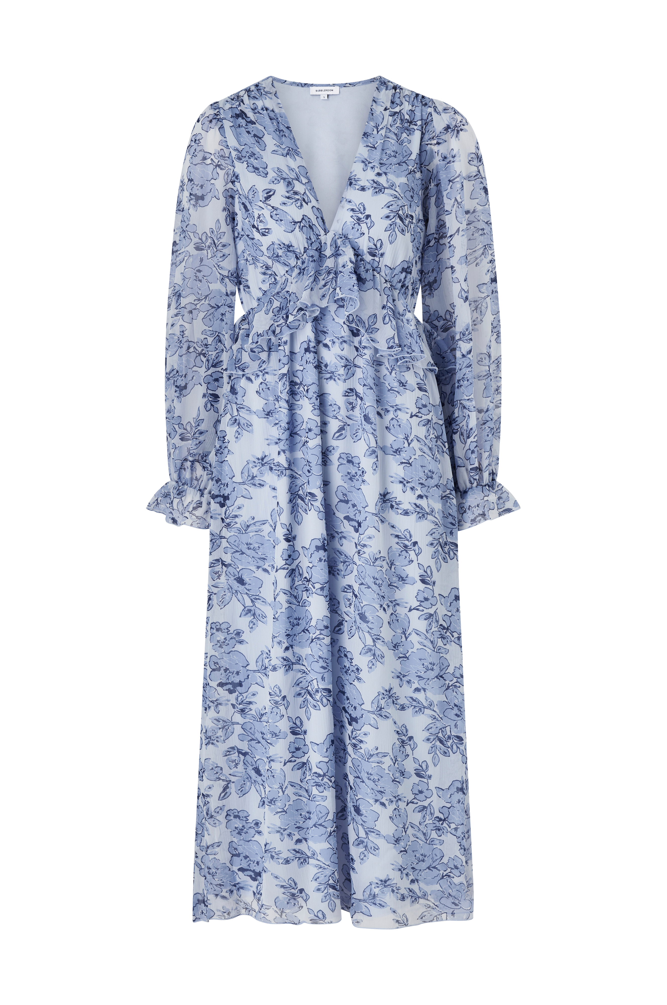 • Foret kjole i chiffon• Volant midt foran og hele vejen rundt• Elastik ved taljen• Lange ærmer• Elastik med volant ved manchetterne• V-ringning• Længde: 132 cm i størrelse S