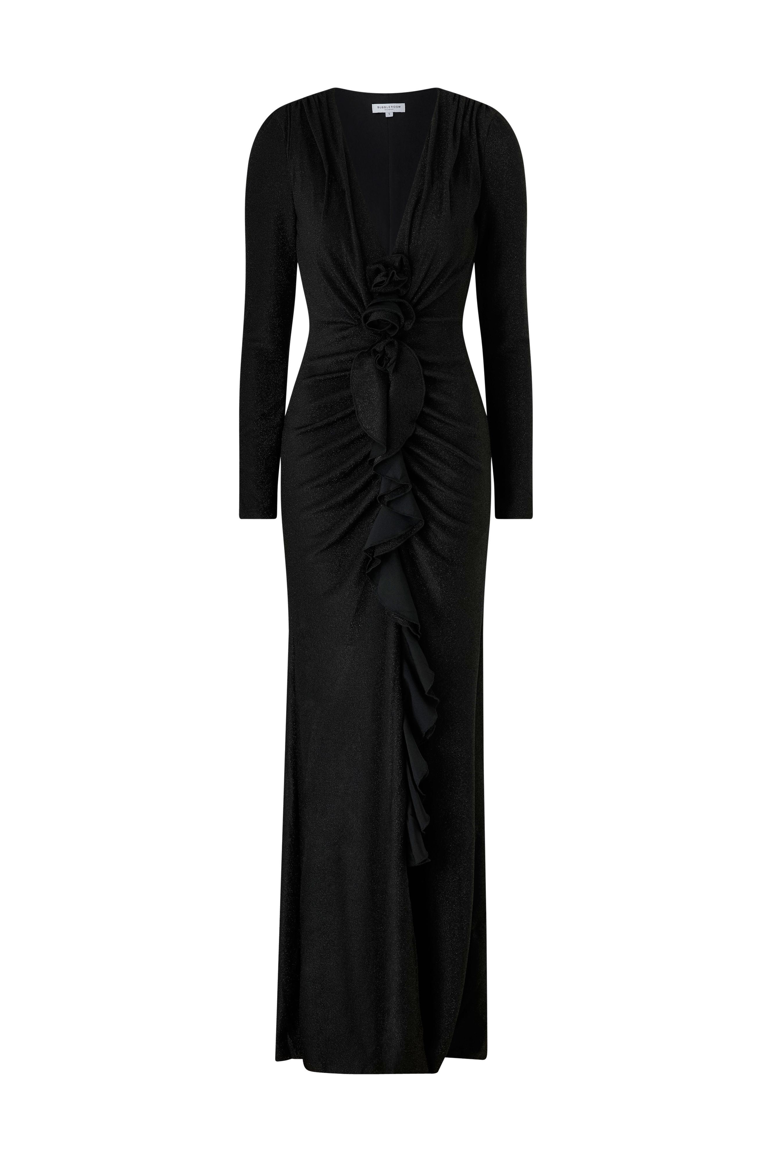 • Lang, foret kjole med skulderpuder• Glitrende, figursyet model• Dyb, v-formet halsudskæring• Lange ærmer• Samling på skuldrene og bagpå• Forside med blomsterapplikationer og volanter• Høj slids nede foran• Længde: 161 cm i størrelse S