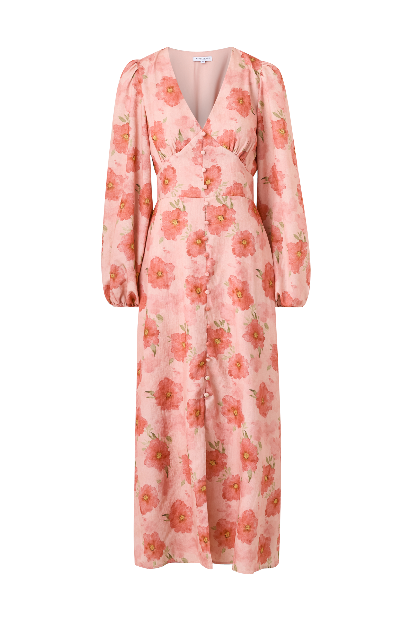 • Lang, foret kjole• V-udskæring• Lange, uforede ballonærmer• Dekorative, beklædte knapper• Smock i ryggen• Slids nede foran• Længde: 136 cm i størrelse 36