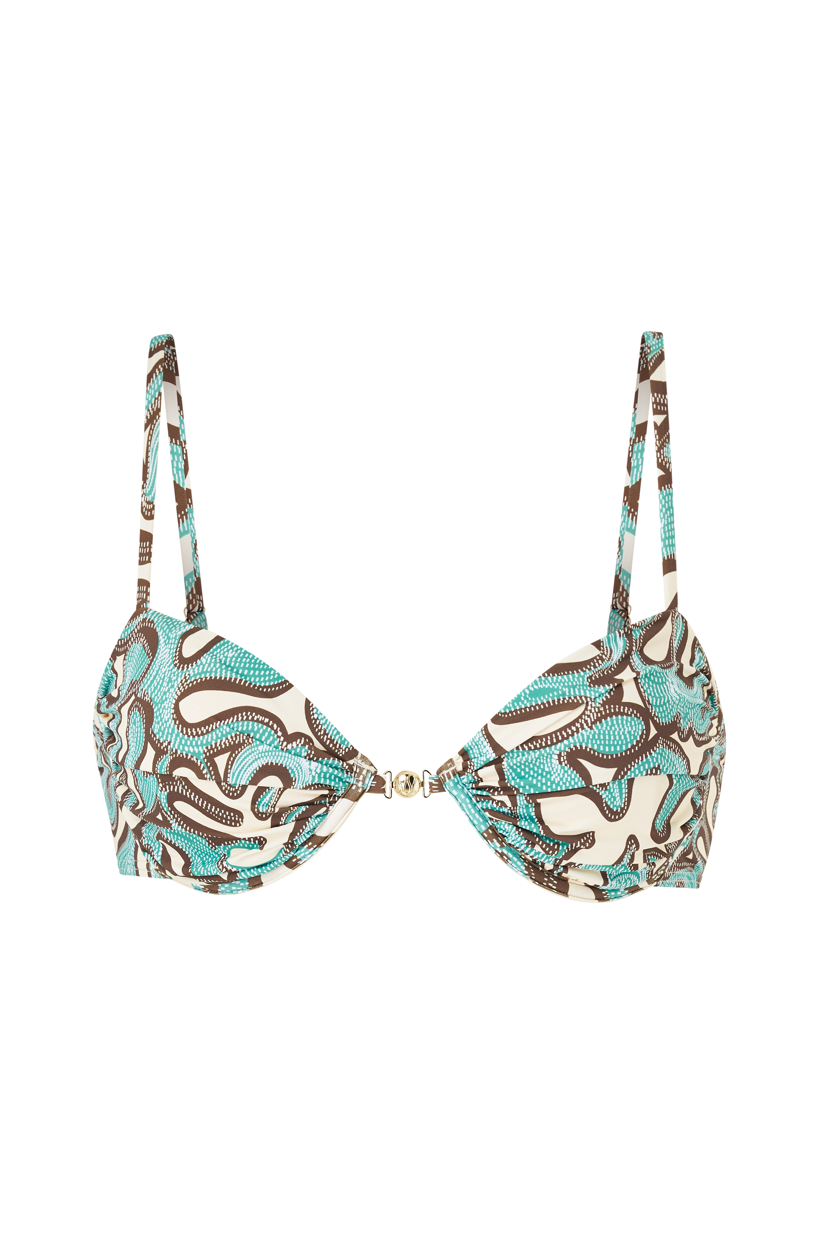 • Mønstret bikini-bh med bøjle• Justérbare skulderstropper• Samling på kopperne• Aftagelig polstring i kopperne• Dekorativ, guldfarvet detalje foran• Spænde bagpå