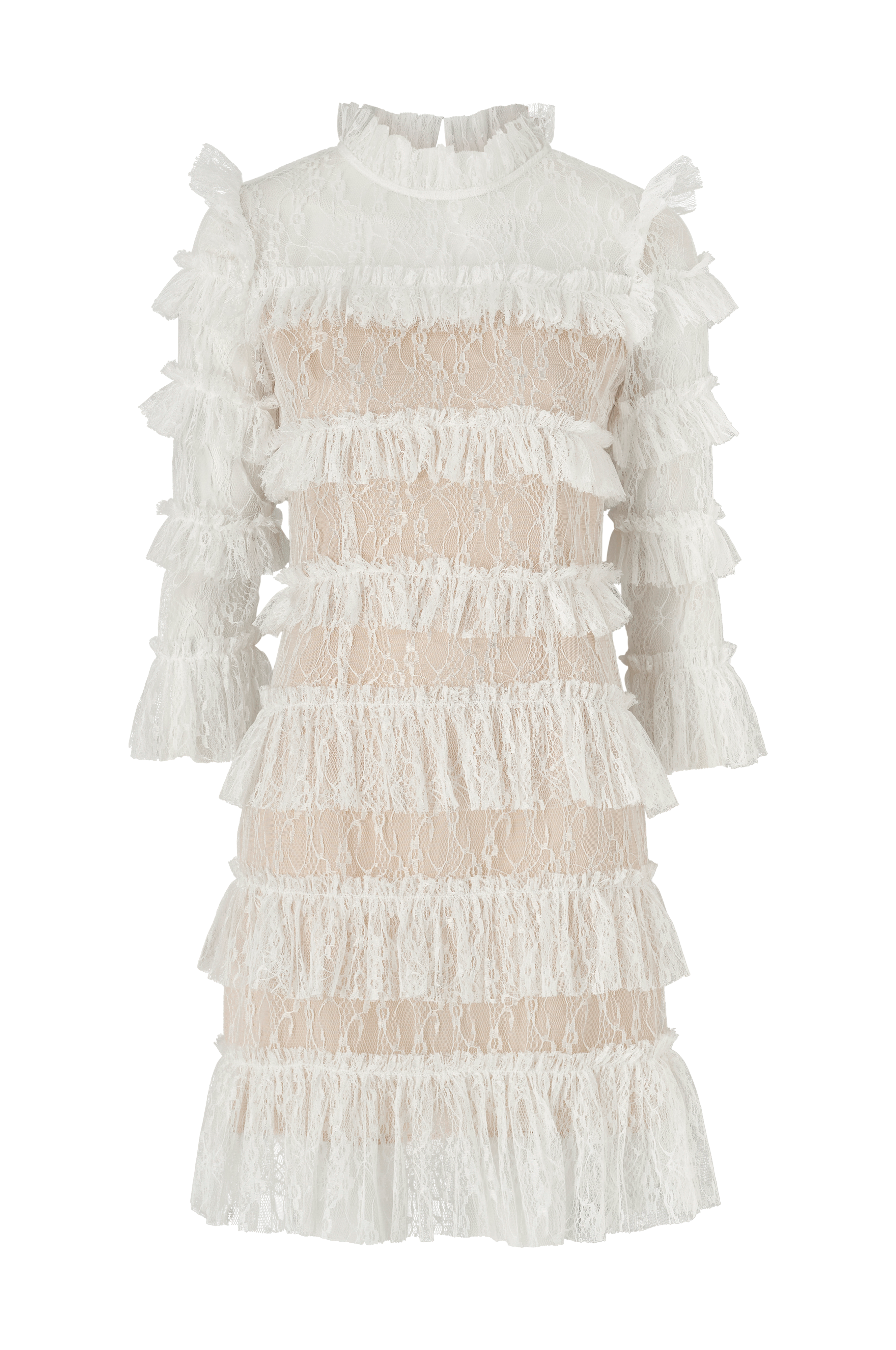 Blondekjole Carmine Mini Dress fra By Malina. Figursyet model i gennembrudt blonde med påsyede flæser rundt om samt høj flæsekrave. Skjult lynlås i ryggen og 3/4-langt ærme. Vævet for fra brystet og ned. Længde ca. 94 cm i str. S.