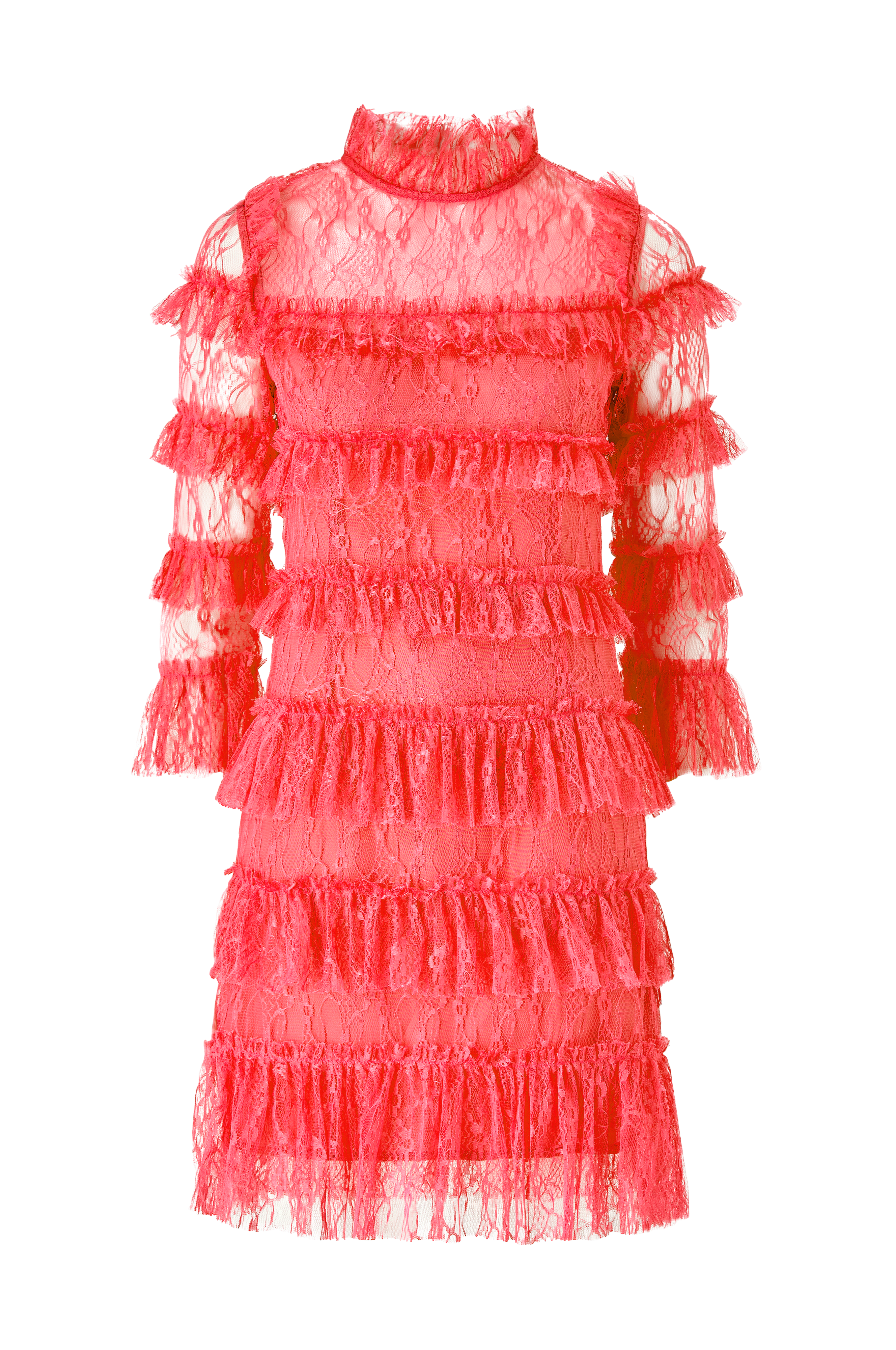 Blondekjole Carmine Mini Dress fra By Malina. Figursyet model i gennembrudt blonde med påsyede flæser rundt om samt høj flæsekrave. Skjult lynlås i ryggen og 3/4-langt ærme. Vævet for fra brystet og ned. Længde ca. 94 cm i str. S.