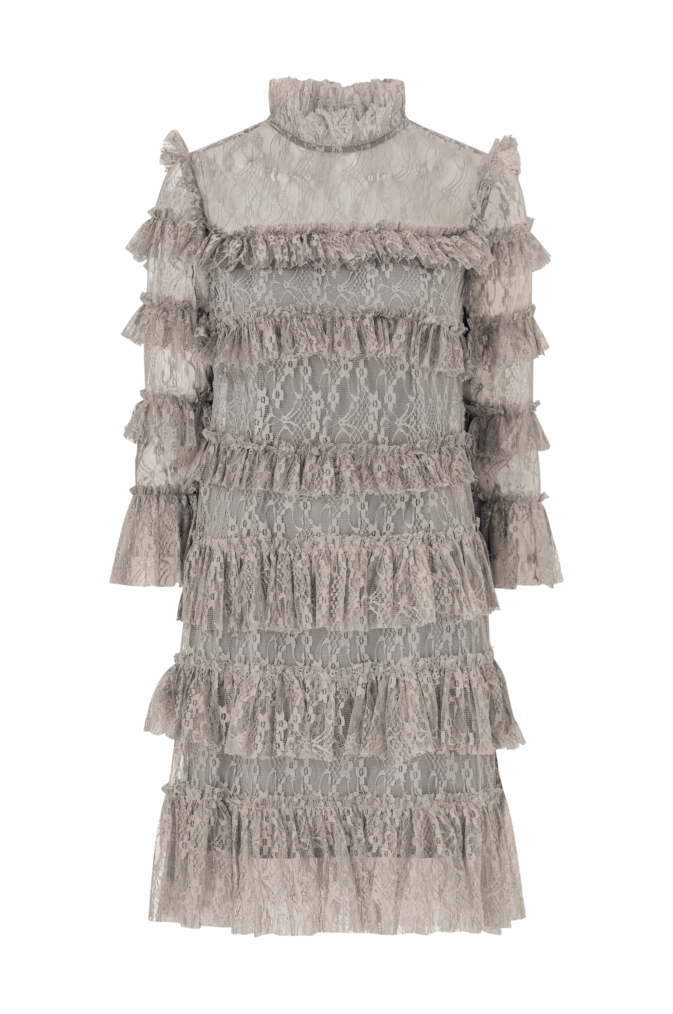 Blondekjole Carmine Mini Dress fra By Malina. Figursyet model i gennembrudt blonde med påsyede flæser rundt om samt høj flæsekrave. Skjult lynlås i ryggen og 3/4-langt ærme. Vævet for fra brystet og ned. Længde ca. 94 cm i str. S.