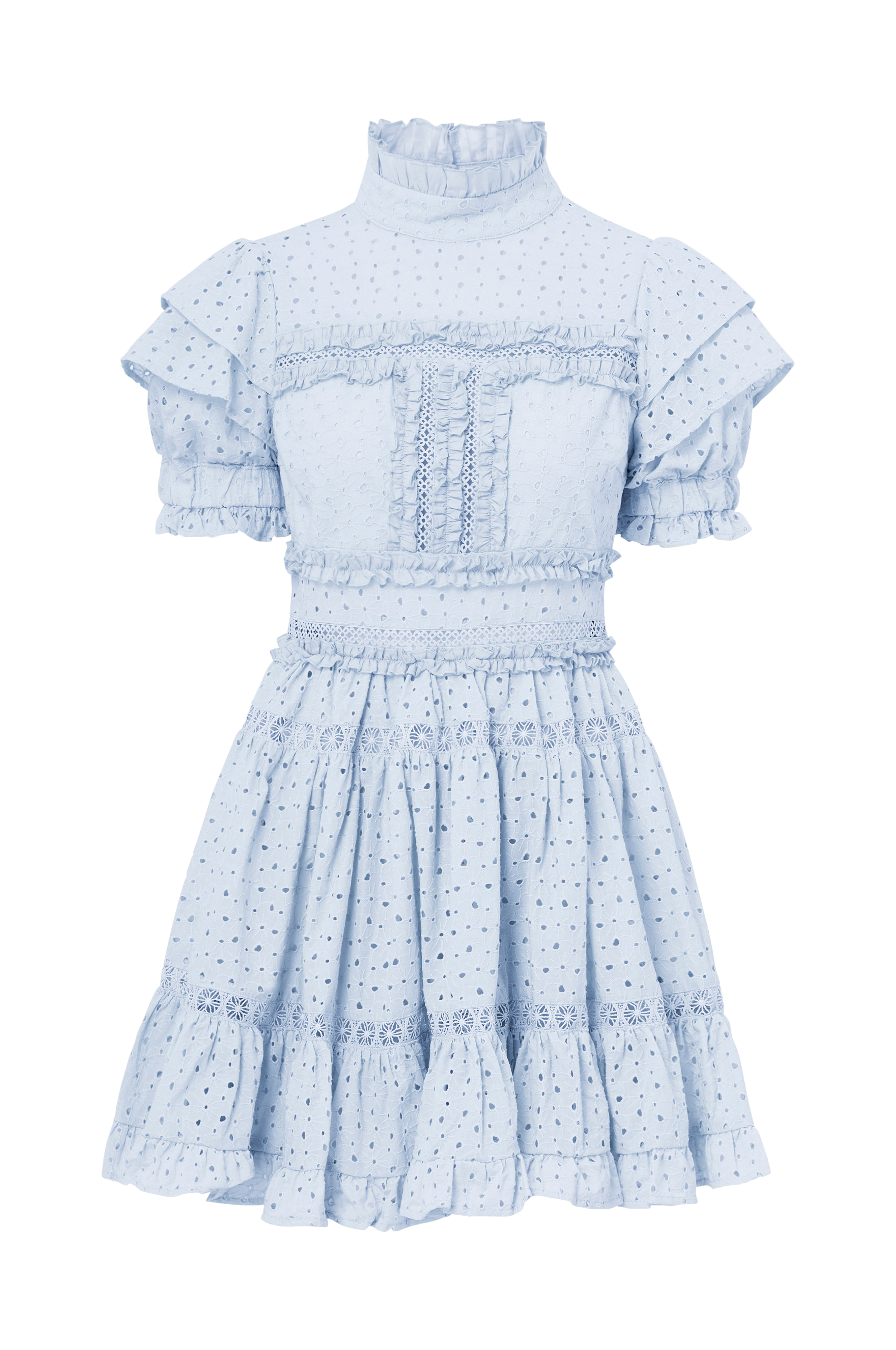 • Kort model med svaj • Korte flagrende ærmer med elastisk bånd ved manchetterne • Ståkrave med volant • Knapper i ryggen • Skjult lynlås i siden • Transparent hulmønster • Længde: 90 cm i størrelse S